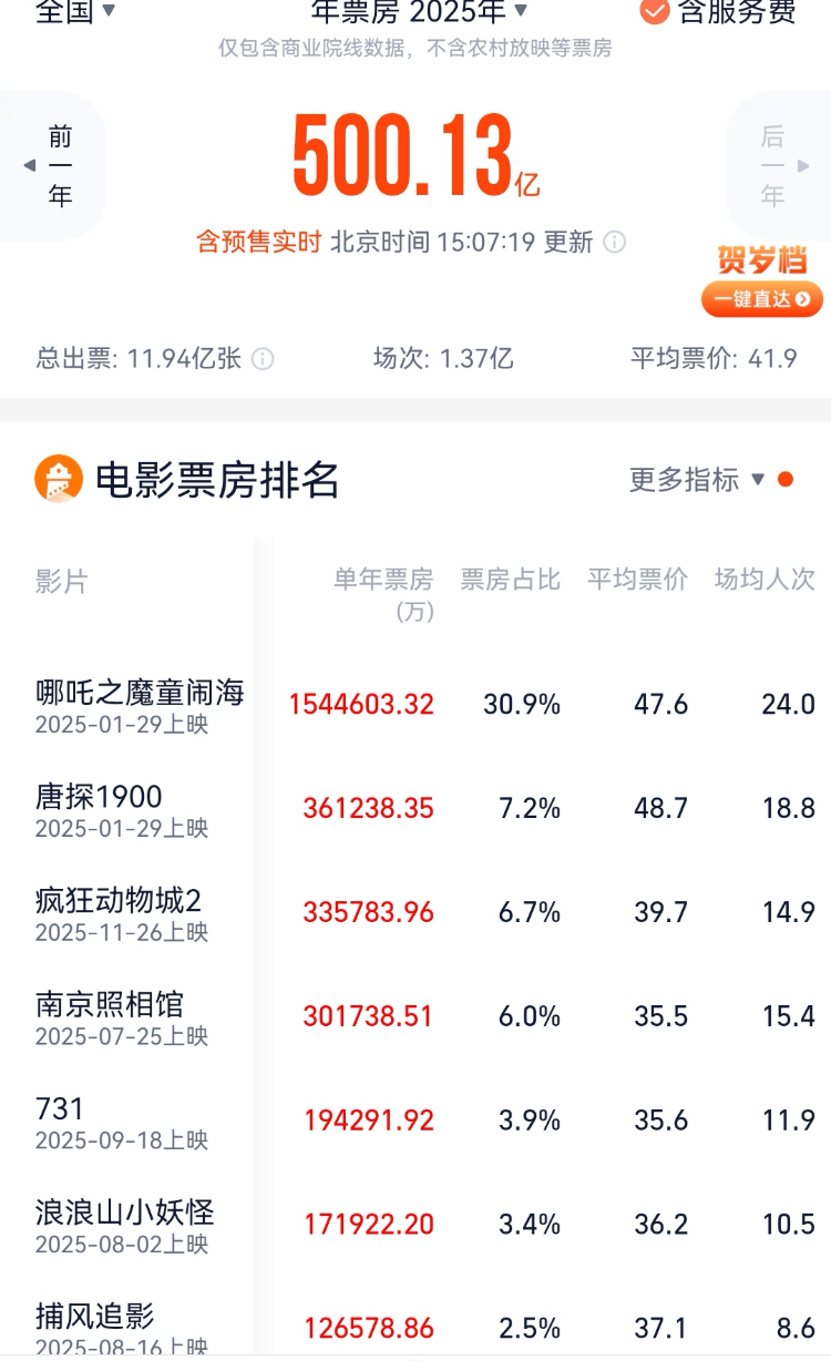 搜狐娛樂訊 (哈麥/文)截止12月13日,2025年全國電影票房突破了500億元,較2024年的425億元增長17.65%。