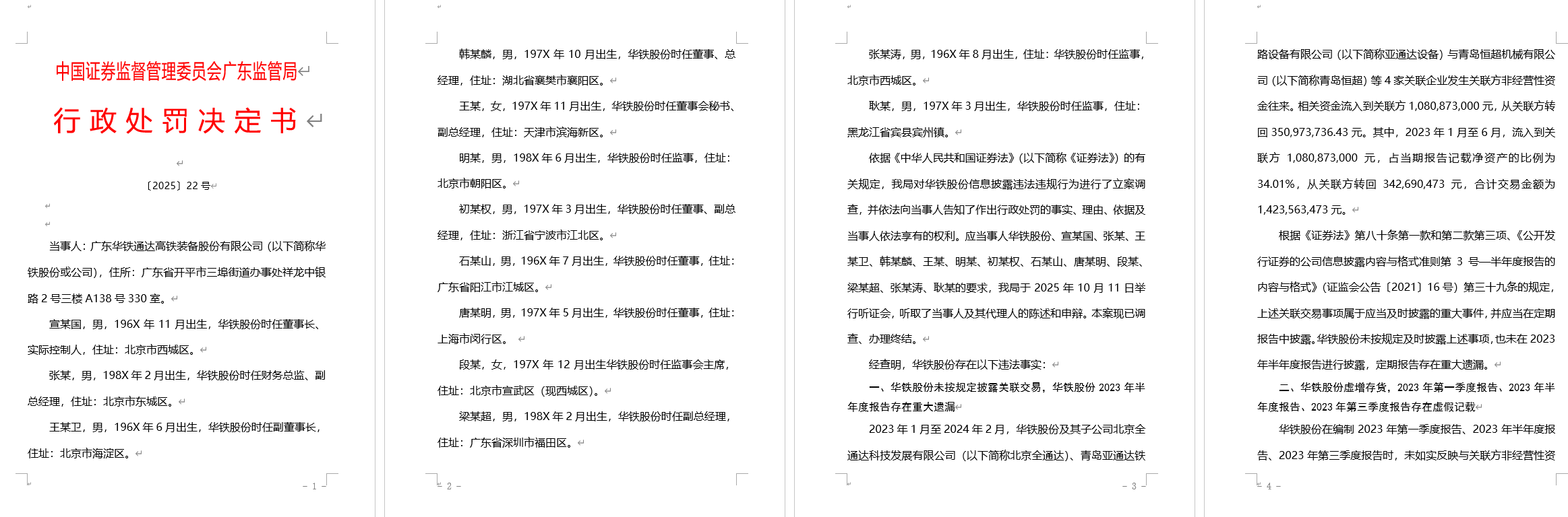 藍鯨新聞12月13日訊,近日,廣東證監(jiān)局發(fā)布行政監(jiān)管措施決定書,劍指廣東華鐵通達高鐵裝備股份有限公司及其相關(guān)責任人。