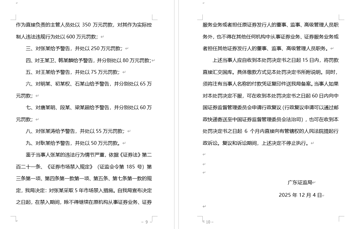 針對以上問題,廣東證監(jiān)局決定對廣東華鐵通達高鐵裝備股份有限公司責令改正,給予警告,并處以500萬元罰款;對宣某國給予警告,并處以950萬元罰款;對張某給予警告,處以250萬元罰款,并采取5年市場禁入措施;對王某衛(wèi)、韓某麟給予警告,并分別處以80萬元罰款;對王某給予警告,并處以75萬元罰款;對明某、初某權(quán)、石某山給予警告,并分別處以65萬元罰款;對唐某明、段某、梁某超給予警告,并分別處以60萬元罰款;對張某濤給予警告,并處以55萬元罰款;對耿某給予警告,并處以50萬元罰款。