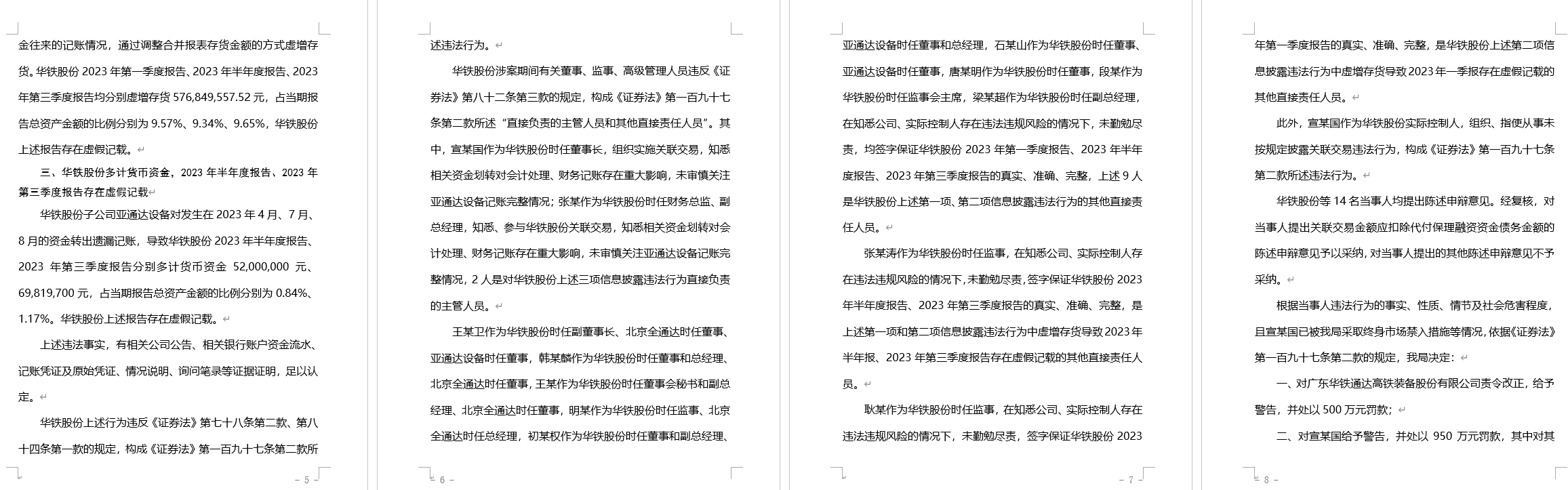 決定書顯示,廣東華鐵通達高鐵裝備股份有限公司存在以下違法事實:華鐵股份未按規(guī)定披露關(guān)聯(lián)交易,華鐵股份2023年半年度報告存在重大遺漏華;華鐵股份虛增存貨,2023年第一季度報告、2023年半年度報告、2023年第三季度報告存在虛假記載;華鐵股份多計貨幣資金,2023年半年度報告、2023年第三季度報告存在虛假記載。上述行為違反了《證券法》的相關(guān)規(guī)定。