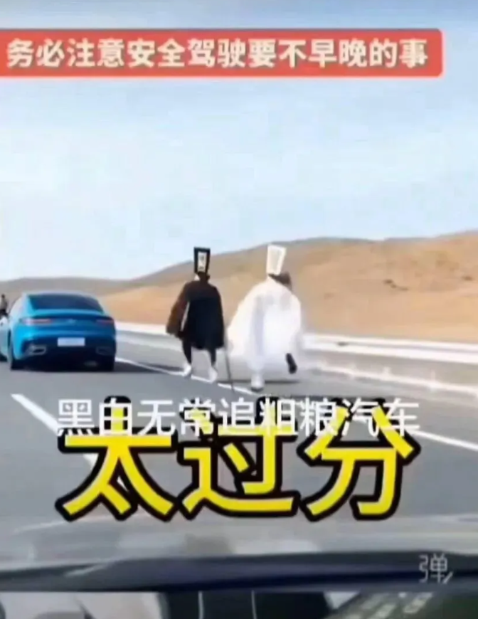 一輛小米SU7汽車(chē)在前面跑,后面跟著“黑白無(wú)?!痹谧?。