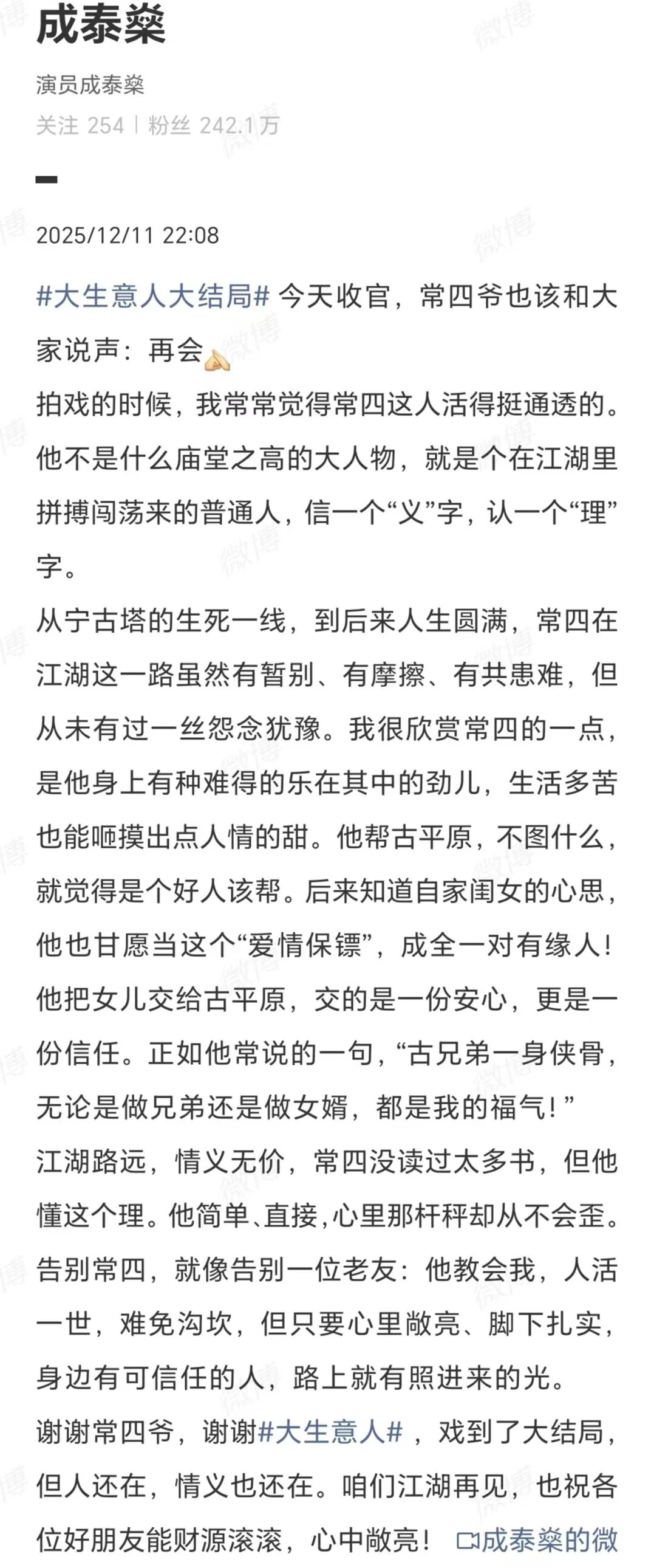 《大生意人》大結局,李純發文告別:
