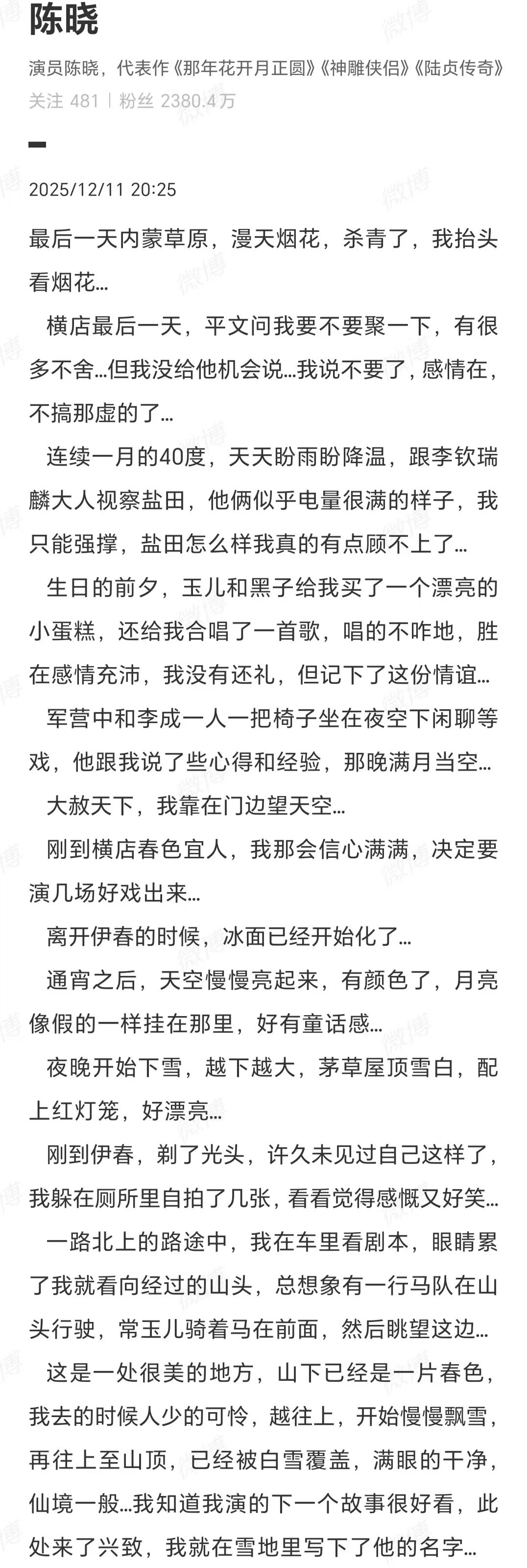 12月11日,也就是《大生意人》點映大結局那天,陳曉發文告別。