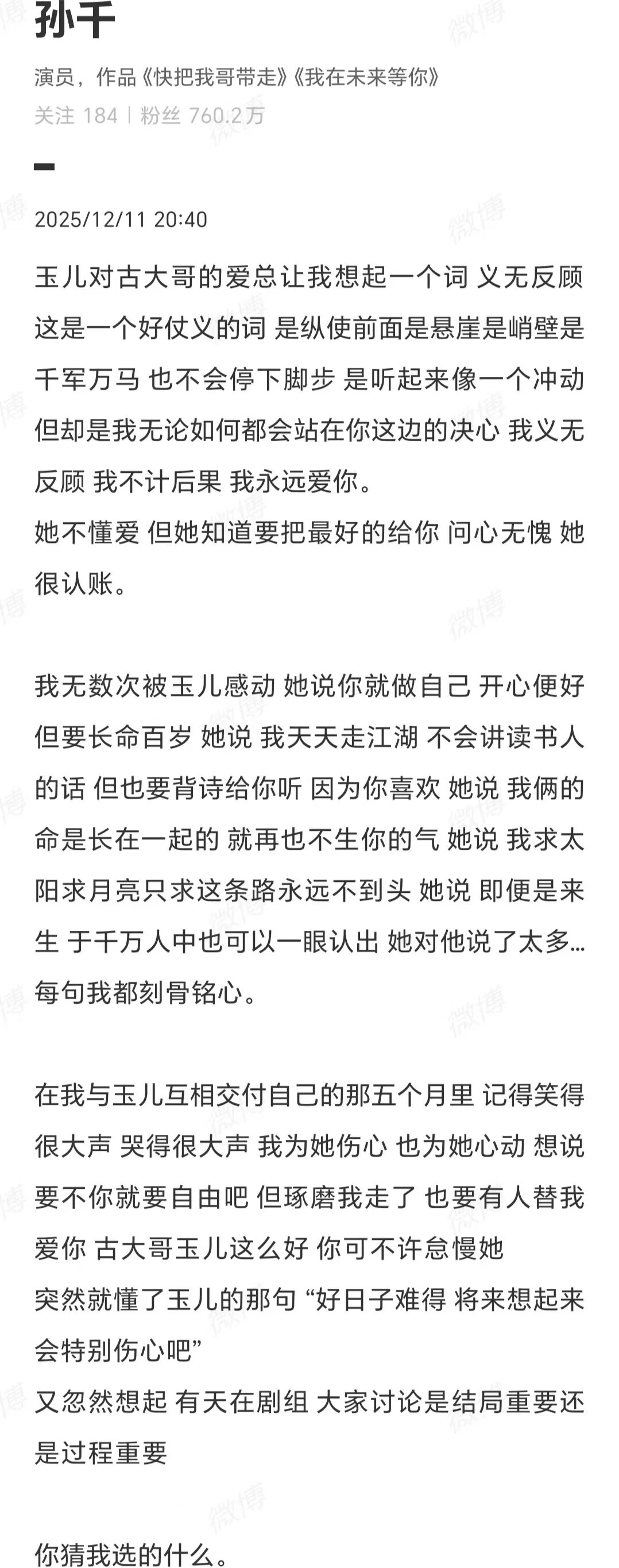《大生意人》大結局,孫千發文告別,談了自己對常玉兒的理解: