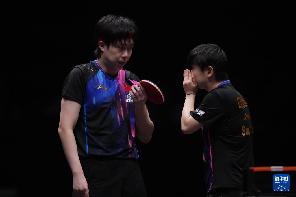 12月13日,王楚欽/孫穎莎(右)在比賽中商討戰術。