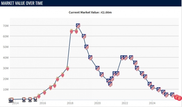 值得一提的是,2018年夏天勒馬爾以7200萬歐元高價加盟馬競,身價也在當時一度達到7000萬歐元。可在加盟馬競后,球員表現始終未能達到預期,為馬競出場186次,僅僅貢獻10球19助的慘淡數據。