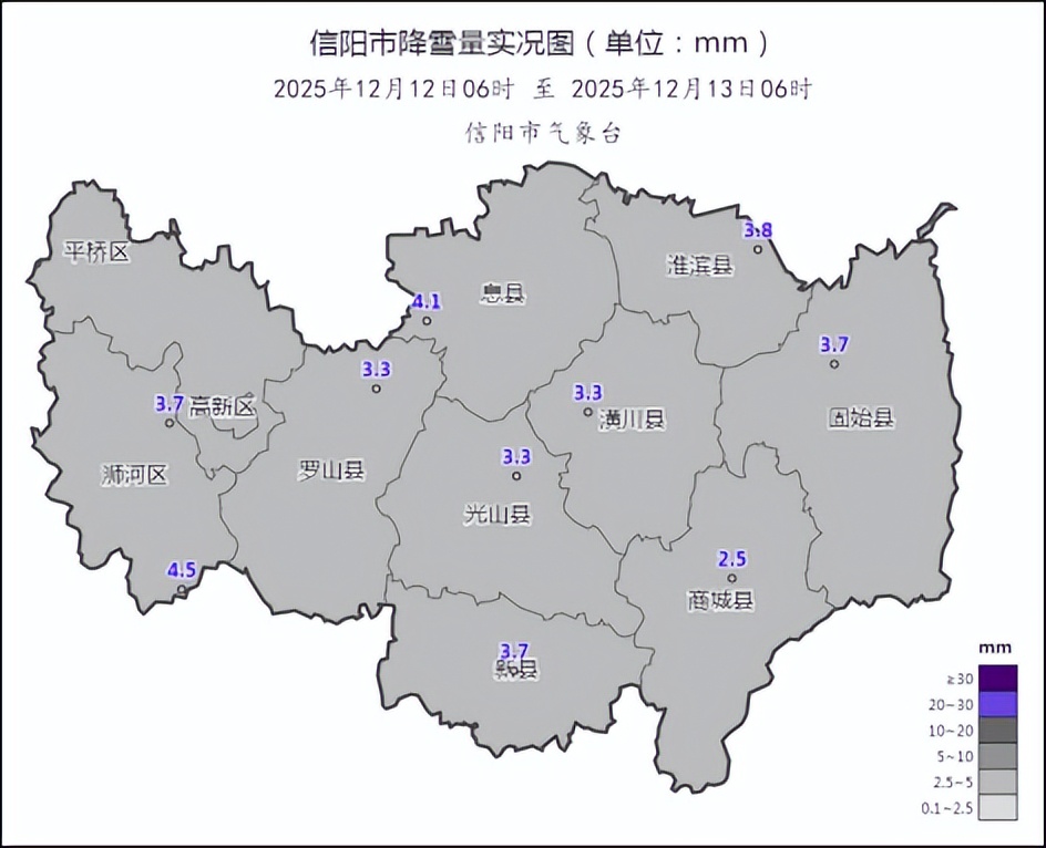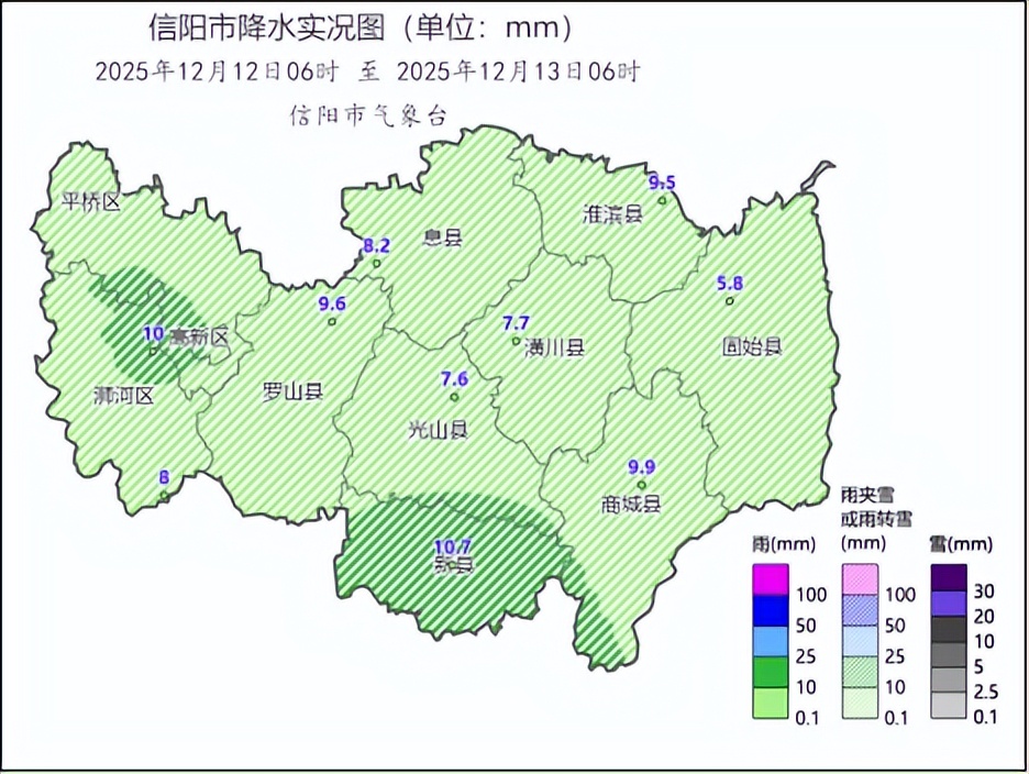 12月12日06時-13日06時,我市出現了雨轉雨夾雪,傍晚到夜間全市雨夾雪逐漸轉中雪,并伴階段性冰粒、凍雨。全市平均降水量8.7毫米,全市國家站降水量(單位:毫米)分別為:新縣10.7,主城區10.0,商城9.9,羅山9.6,淮濱9.5,息縣8.2,雞公山8.0,潢川7.7,光山7.6,固始5.8。全市國家站降雪量(單位:毫米/最大雪深:厘米)分別為:雞公山4.5/2.0,息縣4.1/0,淮濱3.8/0,主城區3.7/0,新縣3.7/2.0,固始3.7/1.0,光山3.3/0,羅山3.3/1.6,潢川3.3/0,商城2.5/0。