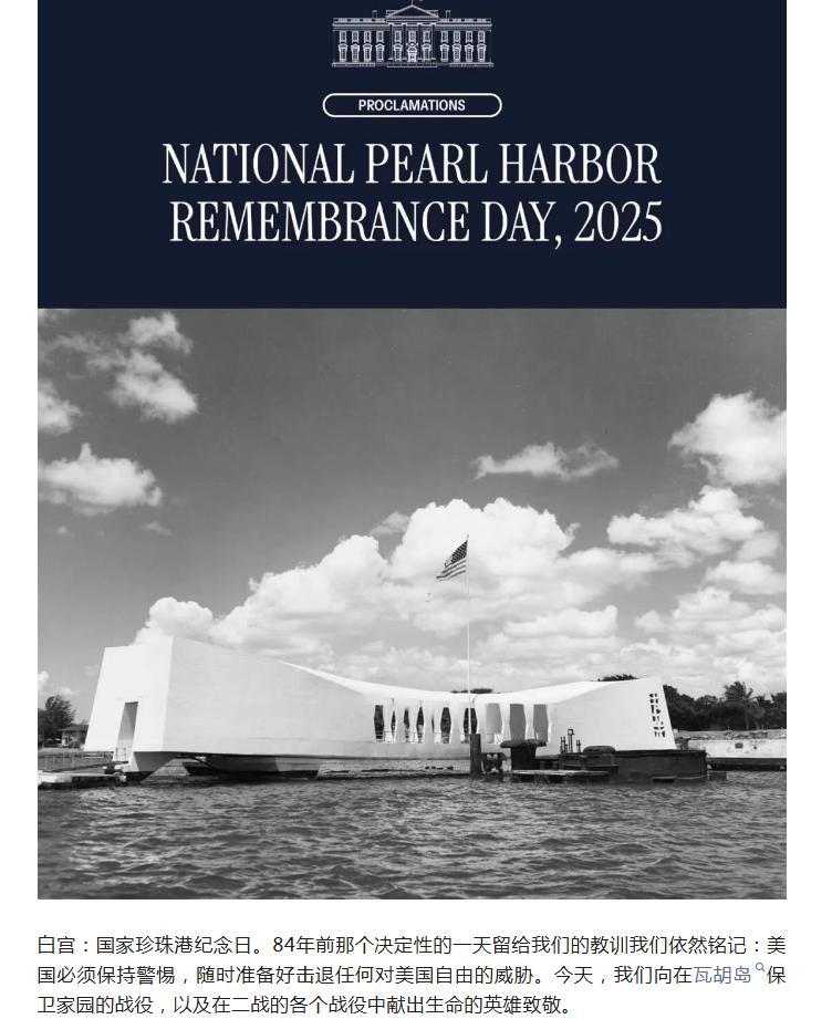 美國駐華大使館的官媒突然宣布一個(gè)信息,美國當(dāng)局在國家珍珠港紀(jì)念日這天要美國全國銘記教訓(xùn),美國必須保持警惕,隨時(shí)準(zhǔn)備打退任何威脅“美國自由”的威脅。那這個(gè)威脅來自哪里?美國當(dāng)局表示,美國全國向在瓦胡島保衛(wèi)戰(zhàn)和二戰(zhàn)各個(gè)戰(zhàn)役中獻(xiàn)身的美軍英雄致敬。