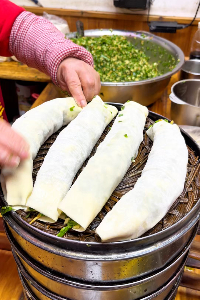 河南特色美食蒸菜蟒,韭菜雞蛋餡,皮薄餡足,吃著帶勁很!
