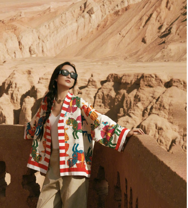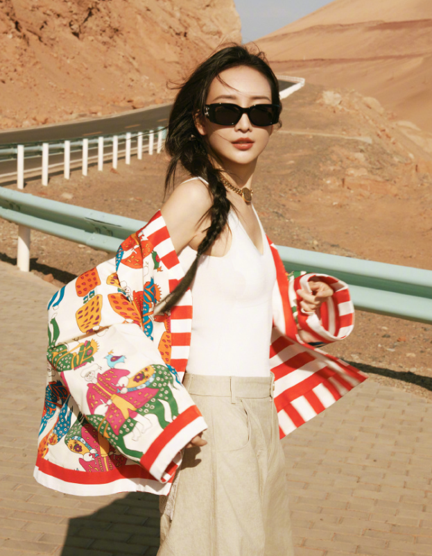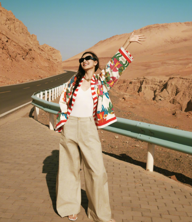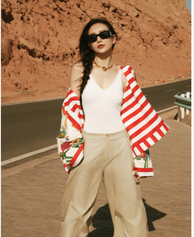 王鷗的這身穿搭時尚又隨性,展現出獨特的魅力。她上身穿著一件簡約的白色V領背心,勾勒出優雅的線條。外搭一件紅白相間的條紋襯衫,襯衫上還帶有鮮艷的花紋圖案,為整體造型增添了活潑與藝術感。下身搭配一條寬松的卡其色闊腿褲,舒適又大氣,很適合戶外出行。她還佩戴了黑色墨鏡和金色項鏈,增添了幾分酷感與精致。整體穿搭風格休閑又不失時尚感,色彩搭配和諧且吸睛,將她的個人氣質完美展現出來。#2025新星計劃4期##2025頂端人氣創作者 ##創作挑戰賽十一期#
