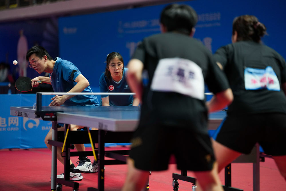 12月8日,香港一團組合何樂榮(左)/曾琝殷在乒乓球XD13混合雙打小組賽中。新華社記者 旦增尼瑪曲珠 攝