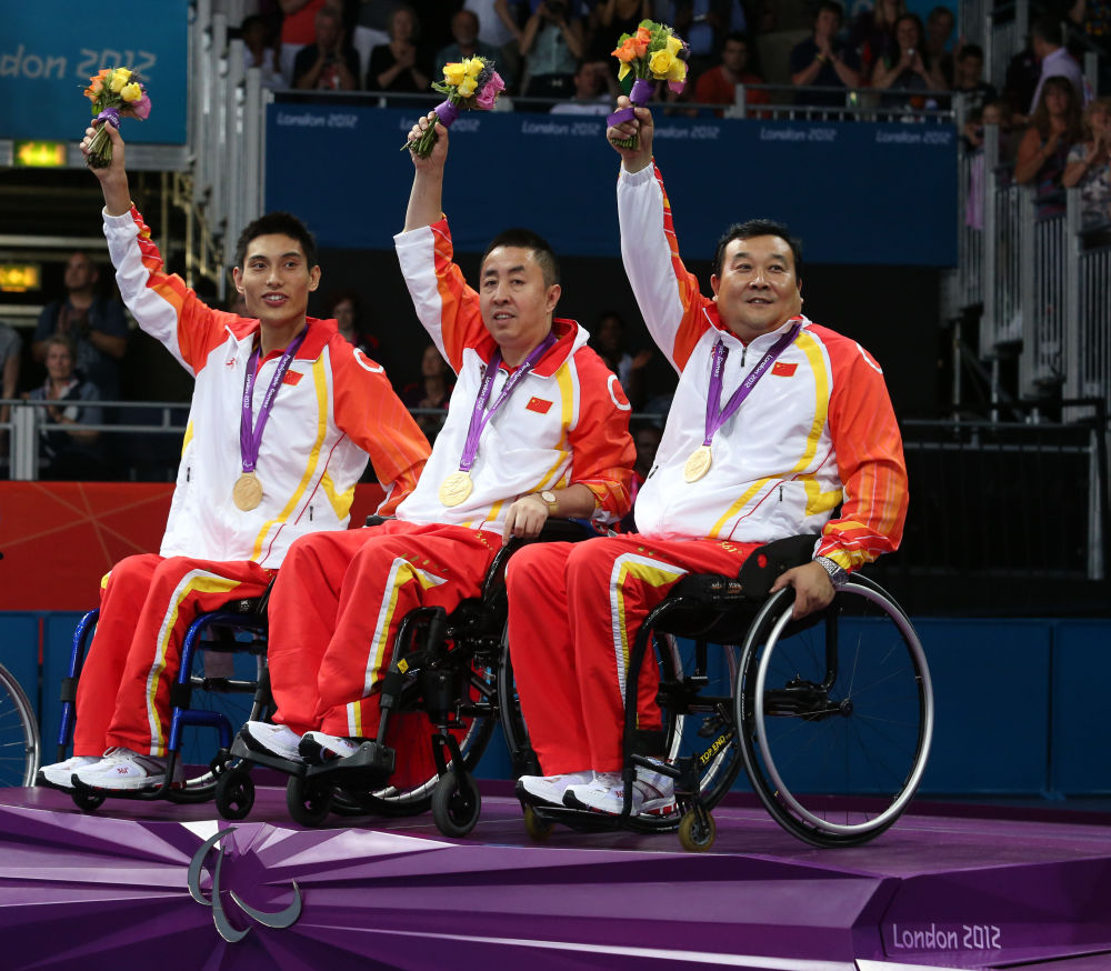 2012年9月7日,中國選手馮攀峰、高延明和趙平(從左至右)在頒獎儀式上。當日,在倫敦殘奧會乒乓球男子團體3級決賽中,中國隊以3比2戰勝德國隊,獲得冠軍。新華社記者 白雪飛 攝