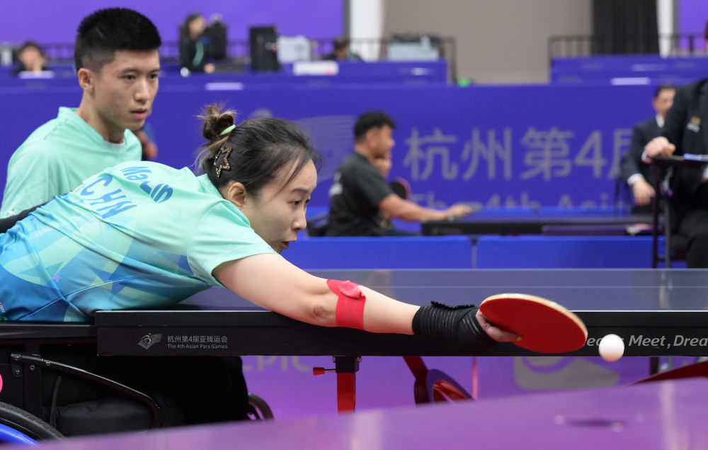 2023年10月26日,毛淋(前)在第四屆亞殘運會乒乓球混合雙打4級B組的比賽中救球。新華社記者 李賀 攝