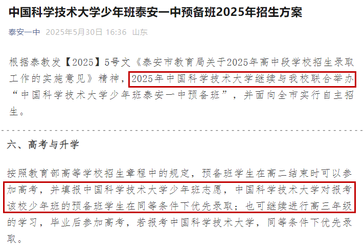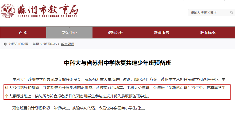 這樣的預備班并不只泰安一中一家獨有,蘇州中學的少預班在江蘇更加出名,官方新聞當中也提到少預班考生報考中科大少創班時,中科大在政策允許范圍內、同等條件下優先錄取!