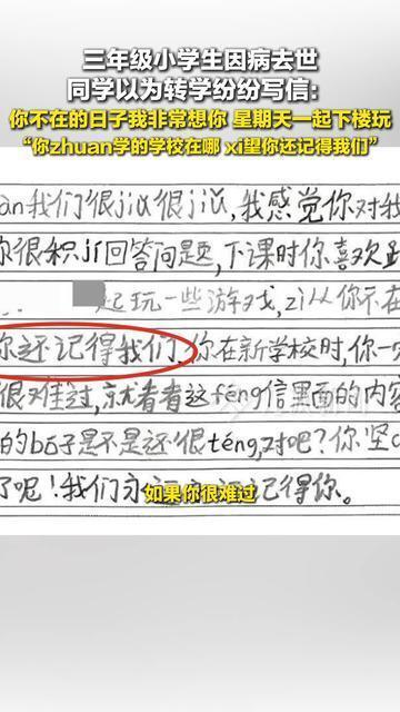 據報道,安徽淮南田家庵區一名三年級小學生因病去世,這讓班主任非常痛心。上課時,班主任并沒有告訴其他小朋友真相,而是說這名同學轉學了,并讓小朋友們給這位同學寫了一封信。孩子們之間樸實無華的友誼感動了網友,有網友表示:“這一刻,我好似明白了紙短情長的真正含義。”