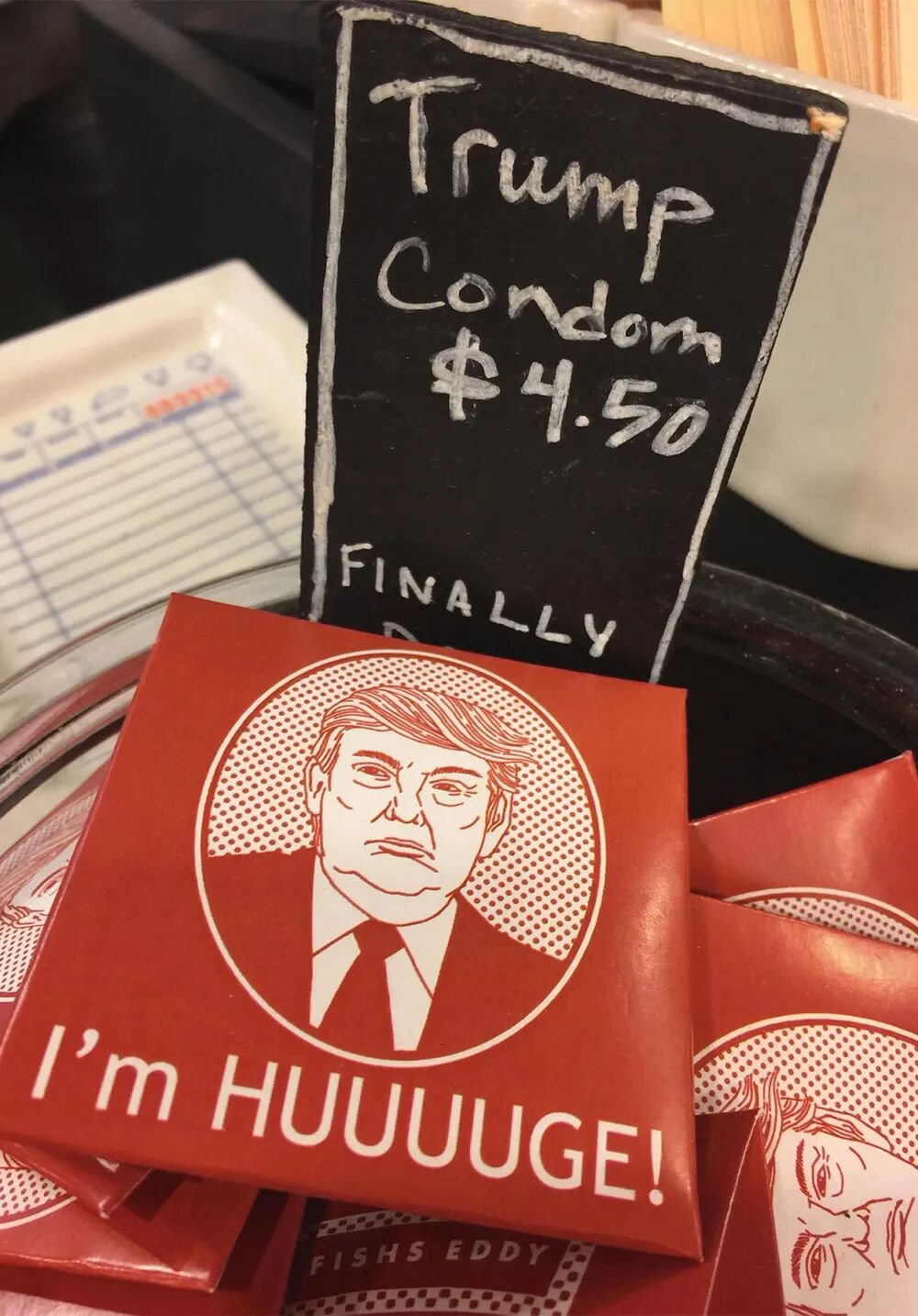 照片中包括一款印有特朗普漫畫頭像的避孕套。?CNN