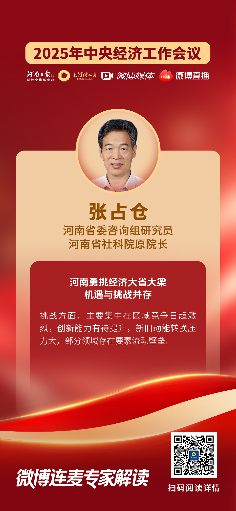 張占倉還表示,在穩定全國經濟大盤中,河南需要發揮三重作用:一是筑牢糧食安全根基,守住農業穩產底線,夯實民生保障底盤;二是以數智化為重要動力做強先進制造業集群,推動新能源汽車、新材料等萬億級產業擴容提質,加快建設制造業強省和數智強省;三是激活內需潛力,依托龐大消費市場拉動經濟增長,發揮“空陸海數”“絲綢之路”通道優勢,銜接國內國際雙循環,以一域穩支撐全局穩,為全國經濟高質量發展做出更大貢獻。