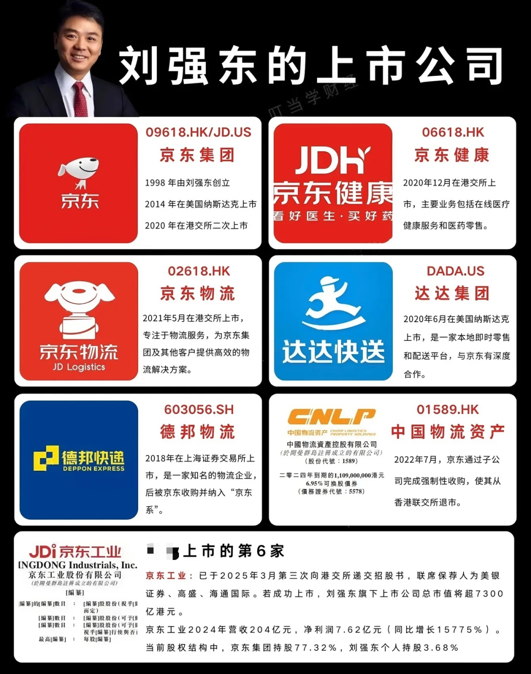 隨著京東工業上市,也標志著劉強東拿下了第六家上市公司,資本矩陣進一步完善,構筑了一個強悍的商業帝國。