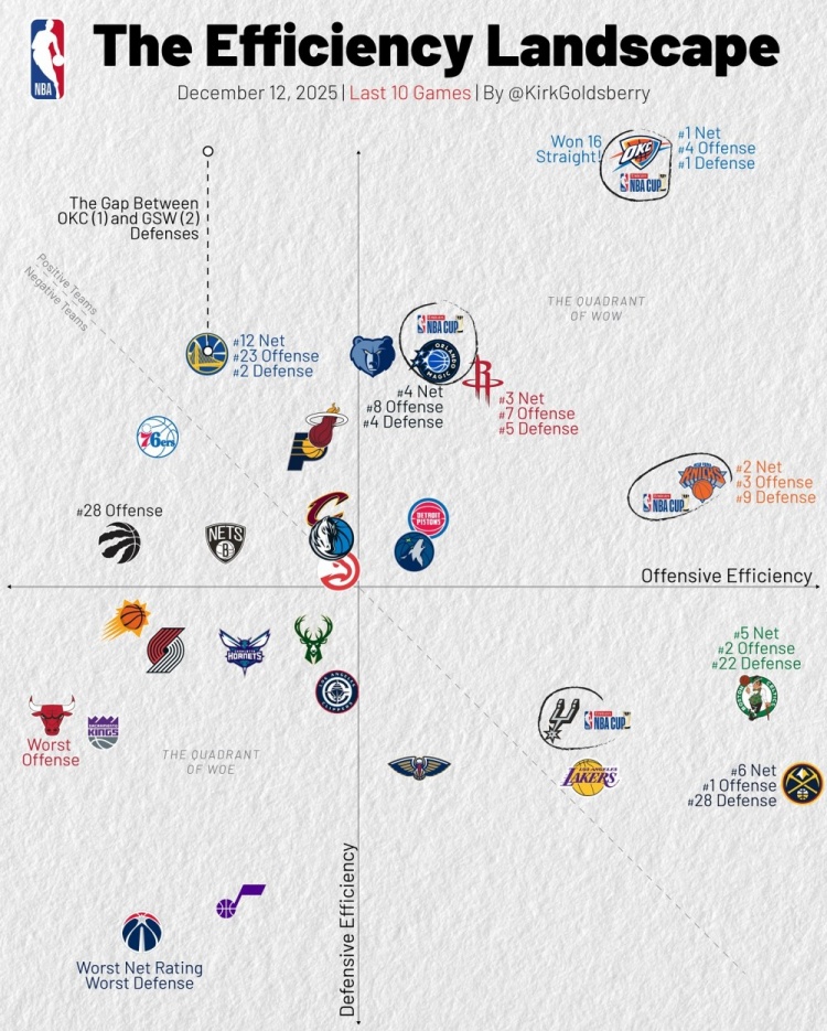 雷霆隊近 10 戰以凈效值 + 15.6 高居聯盟榜首,攻防效率分別位列第 2 和第 4,展現出 “無懈可擊” 的體系實力。球隊憑借鐵血防守構建起聯盟最堅固的防線,防守效率達到 - 11.8,場均僅讓對手得到 104.8 分,內線護筐與外線逼搶的無縫銜接讓對手難以找到進攻節奏。進攻端,雷霆隊依托高效傳切配合,場均送出 28.6 次助攻,多點開花的進攻模式讓防守方顧此失彼。凈效值的絕對優勢印證了雷霆的統治力,他們也成為目前聯盟唯一一支攻防效率均躋身前四的球隊。