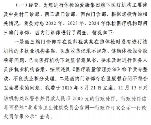 答復(fù)意見書顯示,未發(fā)現(xiàn)其體檢數(shù)據(jù)及結(jié)果存在造假情形,但曾為張曉玲進(jìn)行體檢的兩家愛康國賓門診部確實(shí)存在違規(guī)行為,被行政處罰。
