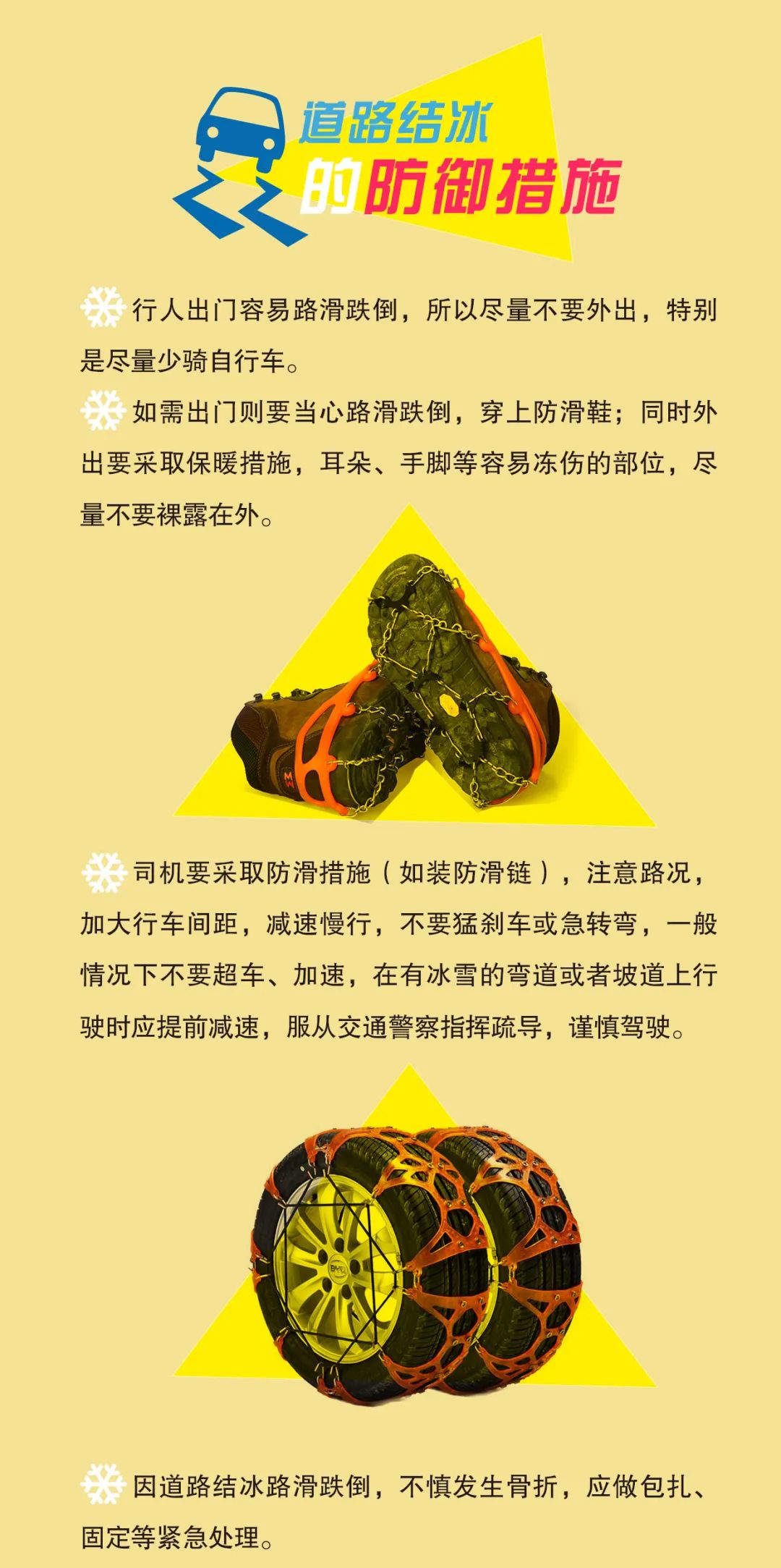 雪天出行,要戴手套,穿保暖的衣服;褲子不可過長,以免踩到褲腳發生跌倒;襪子合腳,不穿滑腳的絲襪;鞋帶要系緊并且鞋帶不可過長,以免踩到鞋帶引起跌倒;挑選合適的防滑鞋。