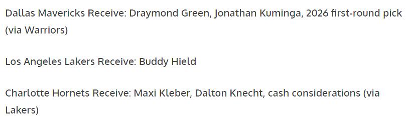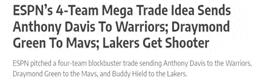 ESPN提出的交易框架具體交易方案如下:金州勇士隊得到:安東尼·戴維斯、梅森·普拉姆利;達拉斯小牛隊得到:德雷蒙德·格林、喬納森·庫明加、勇士隊2026年首輪選秀權;洛杉磯湖人隊得到:巴迪·希爾德;夏洛特黃蜂隊得到:馬克西·克萊伯、道爾頓·克內希特、湖人隊提供的現金補償。理論上,這是一筆充滿話題性的交易方案,但現實層面的考量遠比紙面分析復雜。