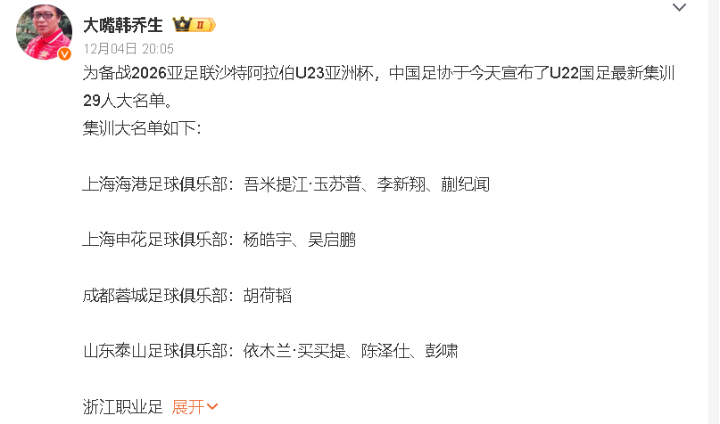 當足協公布U22最新集訓名單時,評論區瞬間炸鍋,大家十分熟悉的王鈺棟、胡荷韜領銜的29人名單里,既有熊貓杯主力劉誠宇的意外落選,也有姚浩洋、張一軒等新面孔的橫空出世。這不僅是教練組的一次戰術押注,更是中國足球青訓成果的殘酷檢驗,為什么這樣說?#2025新星計劃4期##創作挑戰賽十一期##2025頂端人氣創作者 #