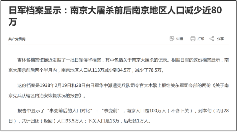 留守的日軍繼續實行恐怖統治,小規模的屠殺時有發生。根據日軍的檔案,南京大屠殺前后兩個半月內,南京人口從113萬銳減至34.5萬。
