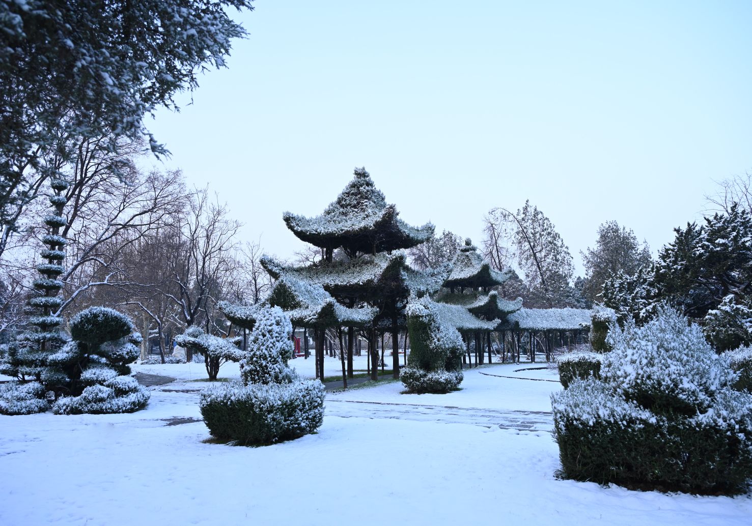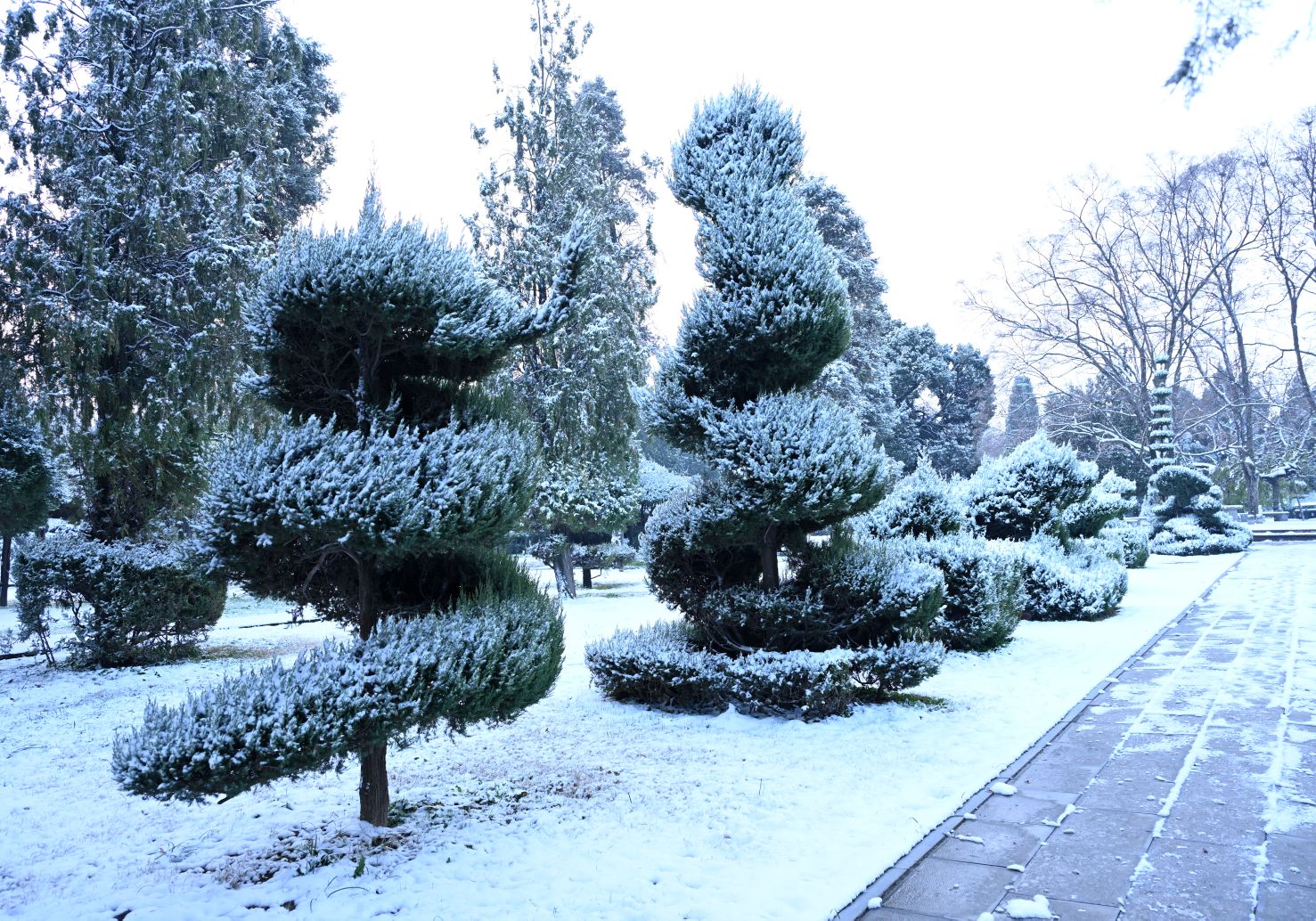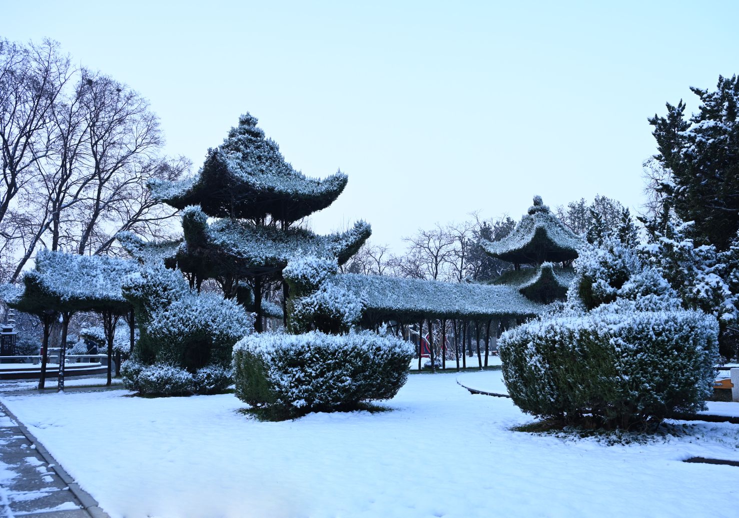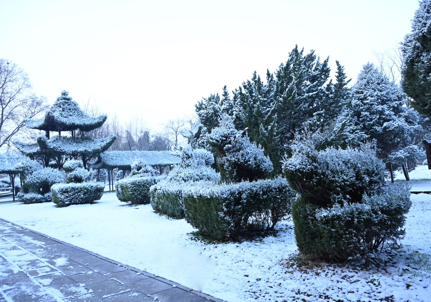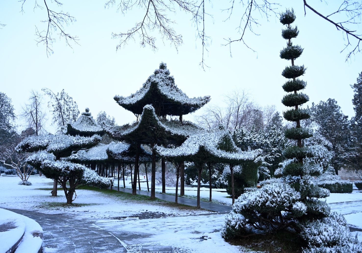 12月12日,一場瑞雪悄然而至,為古城淮陽獨(dú)秀園里的剪枝造型披上一層潔白的銀裝……