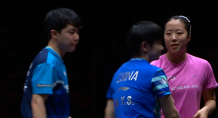 第二局,韓國組合取得4:0的開局。王楚欽/孫穎莎追了1分以后,韓國組合又連得3分,以7:1拉開了分差。在8:2時,王楚欽/孫穎莎打出一波6:1,以8:9落后對手,分差只有1分了。孫穎莎拉球下網,王楚欽揮拍輪空,韓國組合連得2分,以11:8再贏一局,這一場王楚欽與孫穎莎的發揮都不是很好。