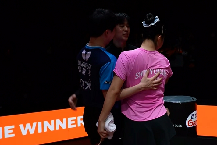 韓國組合奪下這個重要賽事的混雙冠軍后非常開心。他們歡快地與王楚欽/孫穎莎打招呼。申裕斌摟著孫穎莎的肩膀,暖心安慰了莎莎。申裕斌知道孫穎莎受傷了。