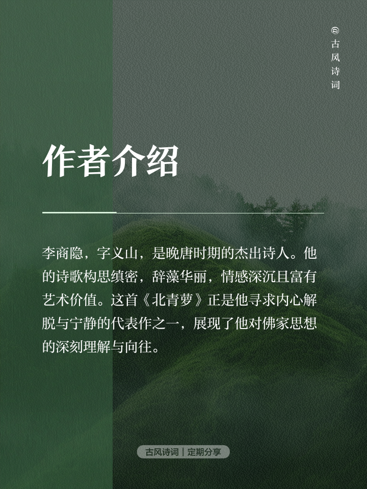 千年后的讀者依然能被這首詩(shī)觸動(dòng),正是因?yàn)槲覀兌荚谀硞€(gè)精神黃昏,踏上過(guò)自己的“北青蘿”。那座山既是實(shí)在的地理存在,也是每個(gè)人內(nèi)心都有的、介于執(zhí)著與解脫之間的緩沖地帶。李商隱的偉大,在于他敢于呈現(xiàn)求道過(guò)程中的所有猶疑與踉蹌,并將這種不完美的追尋,鍛造成了一盞照亮中國(guó)詩(shī)歌夜空的、帶著人性溫度的孤燈。