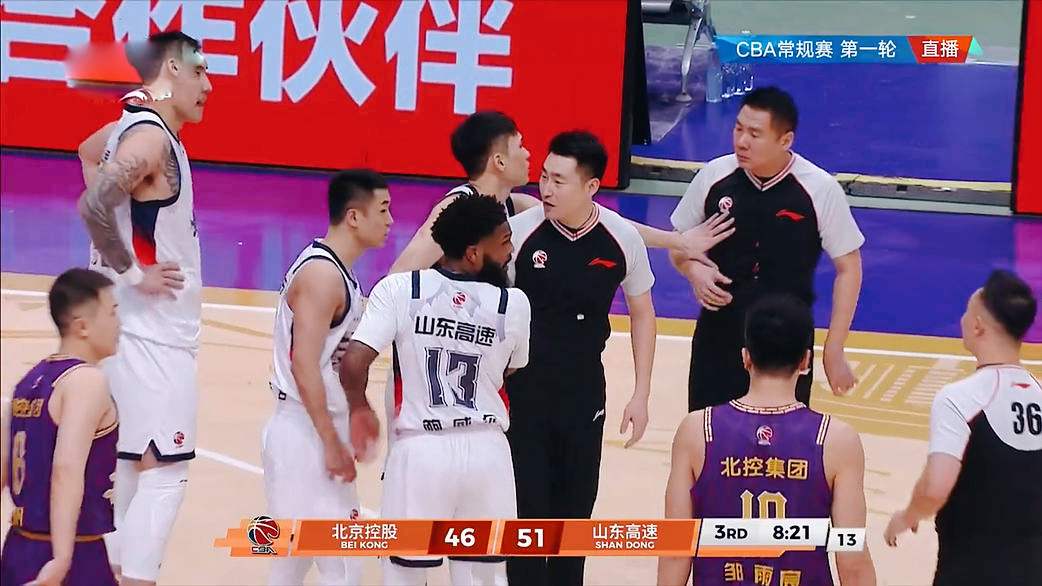 下半場回來,北控一個回合連搶4個進攻籃板!裁判短時間連吹山東男籃犯規,引發了隊長高詩巖和主教練邱彪的強烈不滿。陶漢林很快吃到三次犯規,不得不提前下場。珀塞爾挺身而出連得五分,楊帆連中遠投。于德豪壓哨三分命中,三節比賽戰罷,山東男籃保持兩分的優勢。