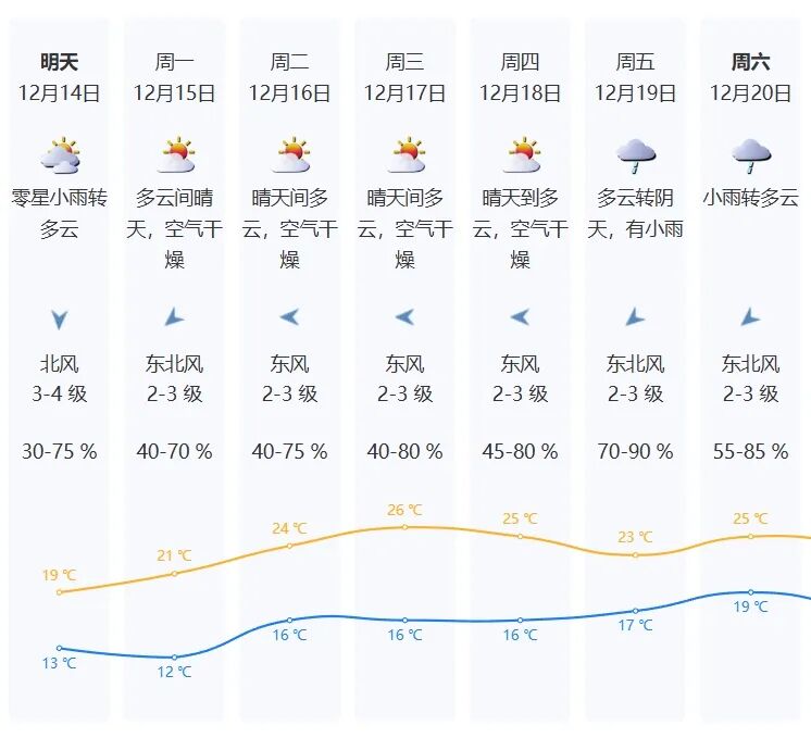 14日白天漸轉(zhuǎn)多云,風(fēng)力逐漸減弱,氣溫13-19℃,天氣漸轉(zhuǎn)干燥;