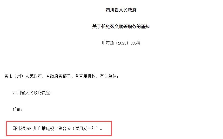 12月12日,四川省人民政府發布通知,任命鄭偉強為四川廣播電視臺副臺長(試用期一年)。