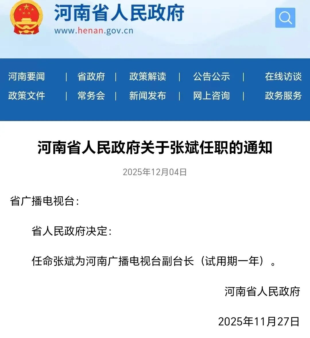 12月4日,河南省人民政府發布通知,任命張斌為河南廣播電視臺副臺長(試用期一年)。
