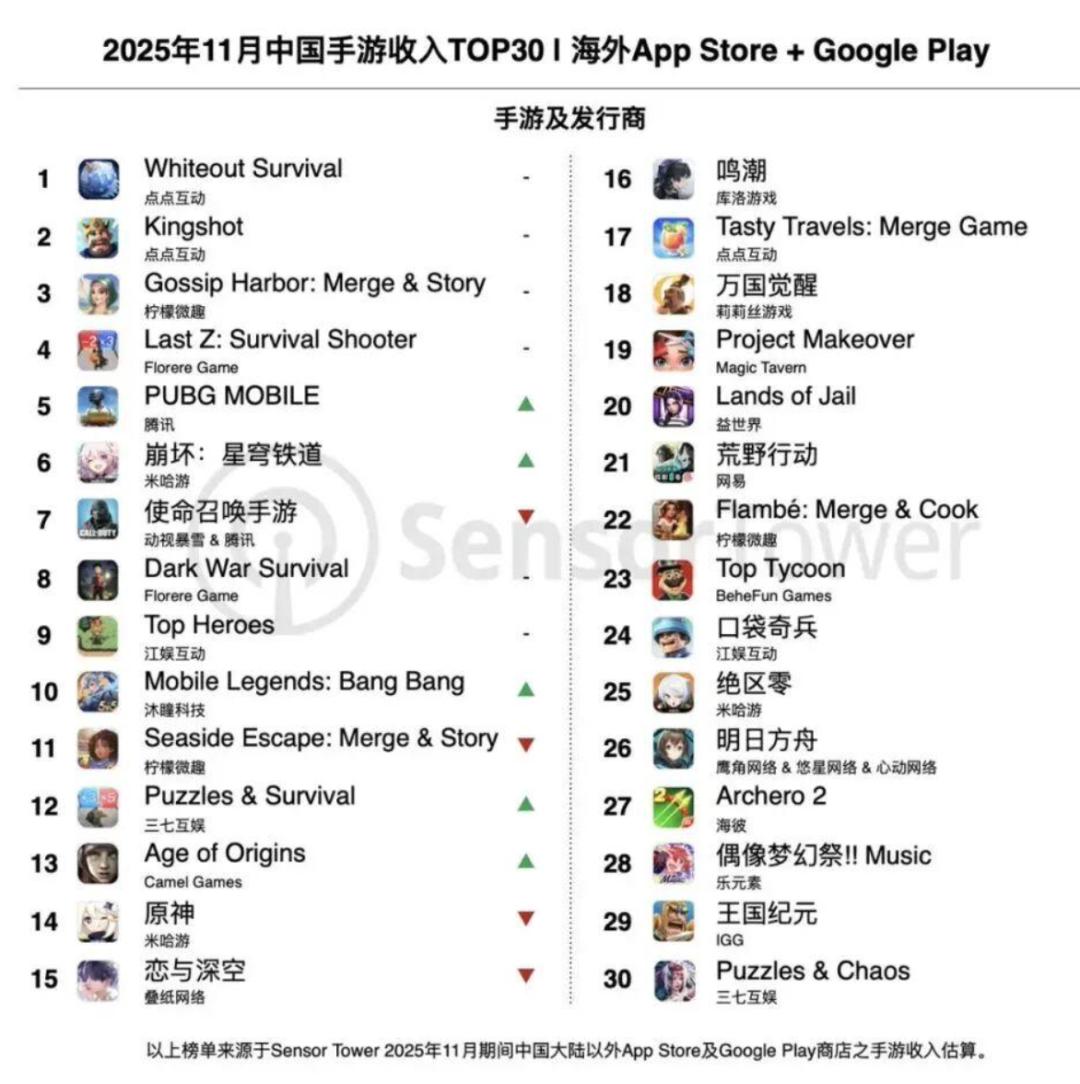據Sensor Tower不久前發布的2025年11月中國手游產品在海外市場收入排行TOP30榜單,點點互動旗下兩款主打游戲《Whiteout Survival》(無盡冬日)和《Kingshot》(奔奔王國)繼續包攬收入榜冠亞軍,再次證明了其在海外市場的強大吸引力。