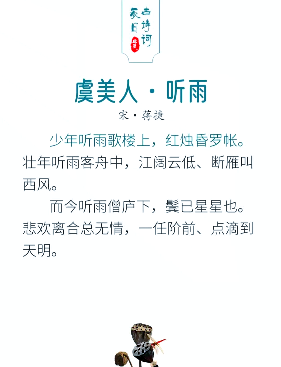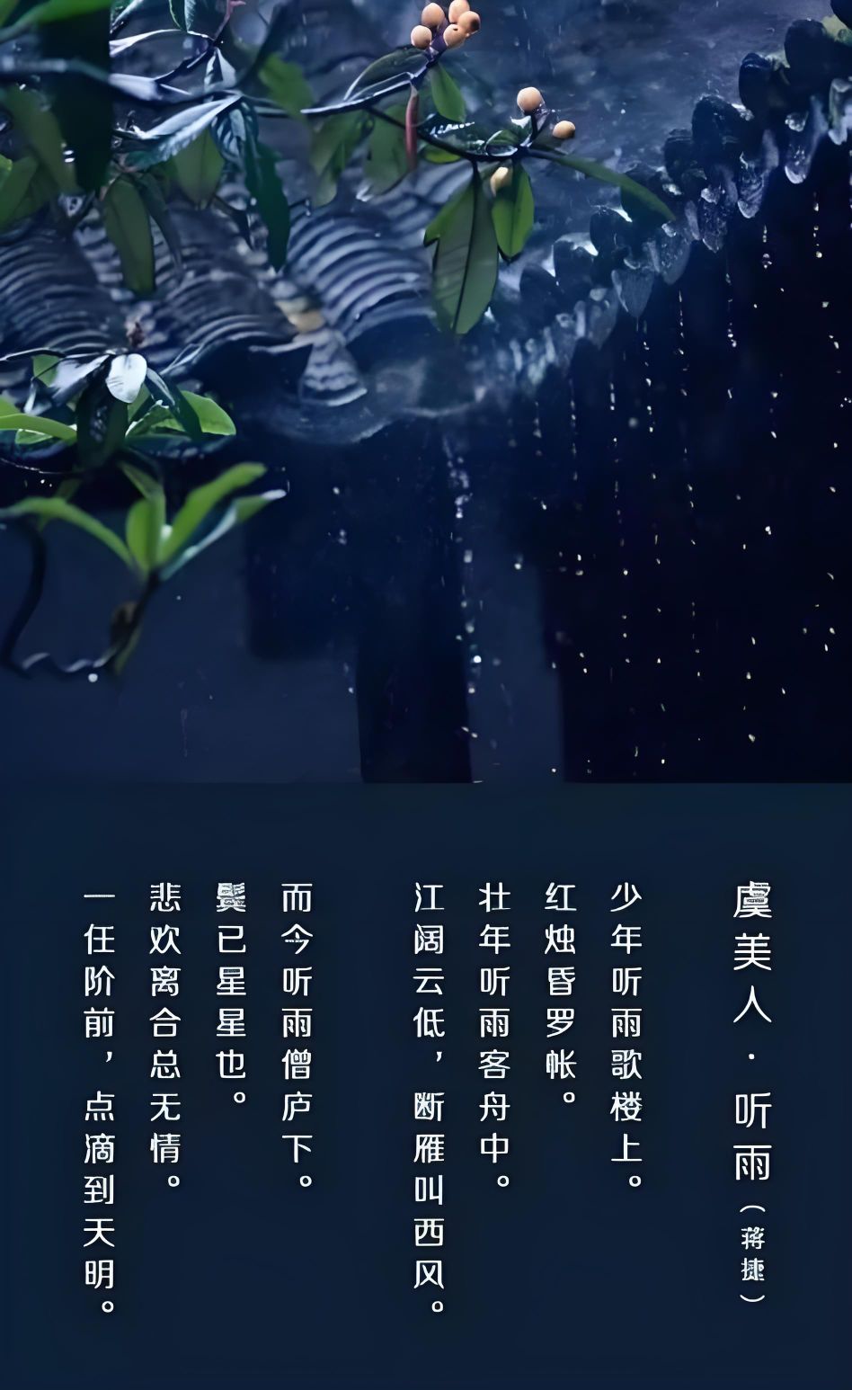 這闋詞最終完成的,是對“抒情傳統”的創造性轉化。雨這個古典詩詞的常見意象,在蔣捷筆下變成了歷史時間的液態計量單位。每一個雨滴都承載著記憶的重量,每一聲雨響都叩擊著遺民的集體創傷。當我們在七百年后重讀這首詞,依然能清晰聽見那穿越時空的雨聲三疊——它提醒我們,有些歷史轉折如此劇烈,以至于個體需要用整個余生,去消化那一場下在改朝換代之際的、漫無止境的冷雨。