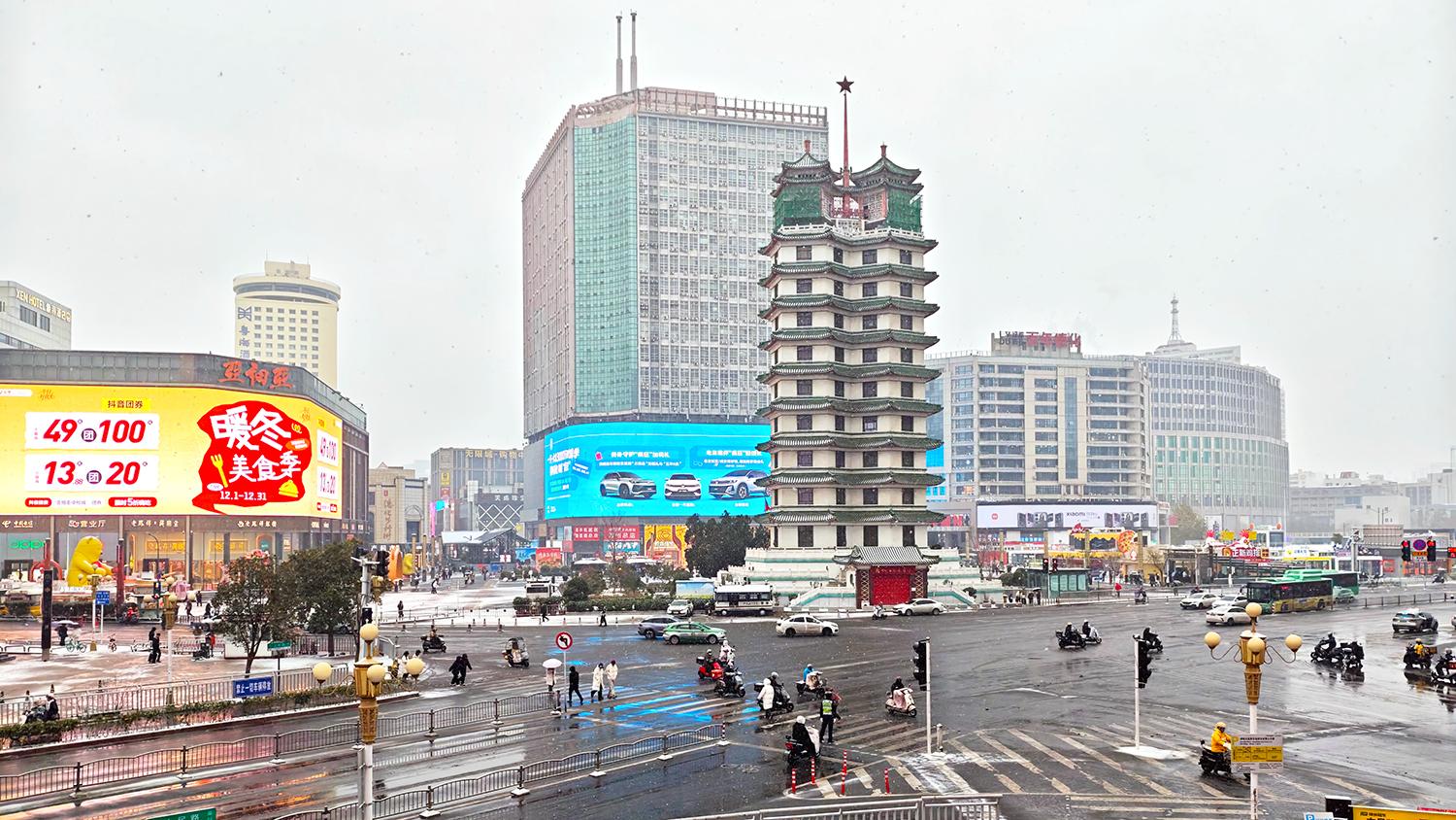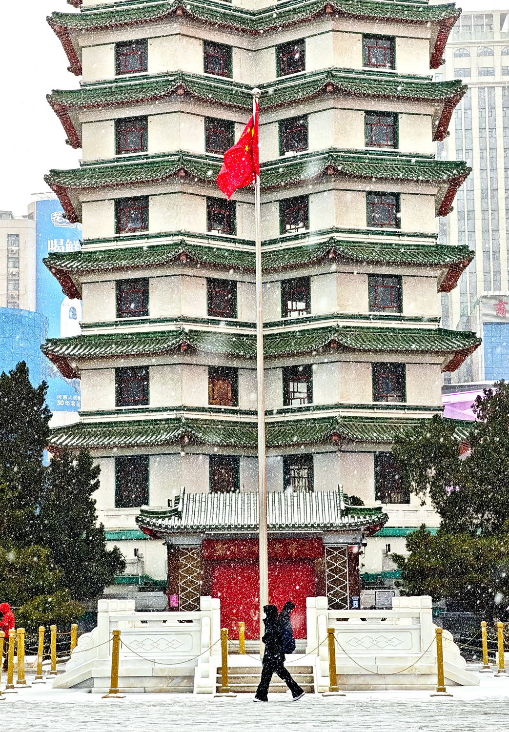 12月12日,鄭州今冬首場雪翩然而至,二七紀(jì)念塔在紛揚(yáng)雪花中更顯莊嚴(yán)肅穆。