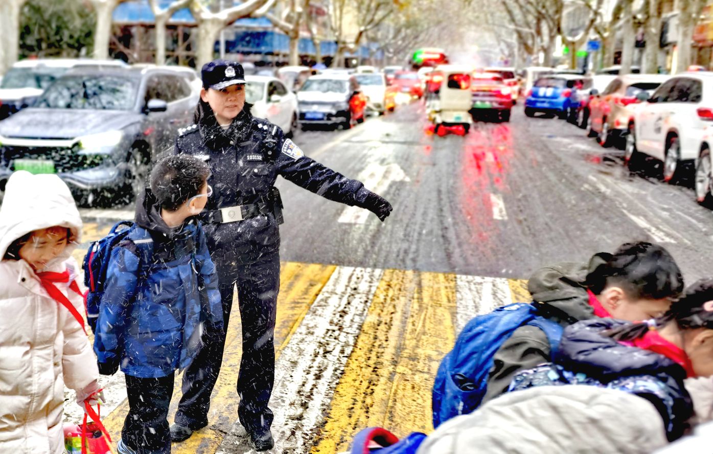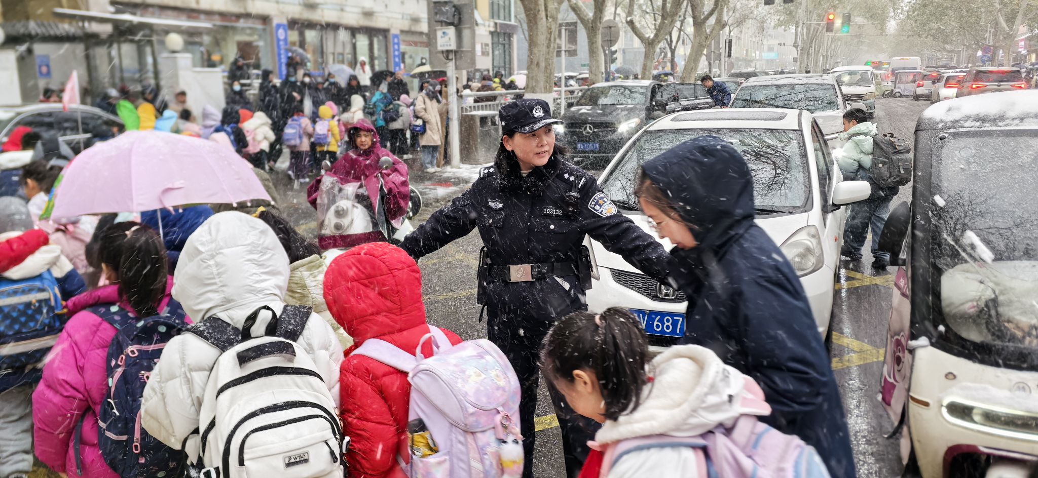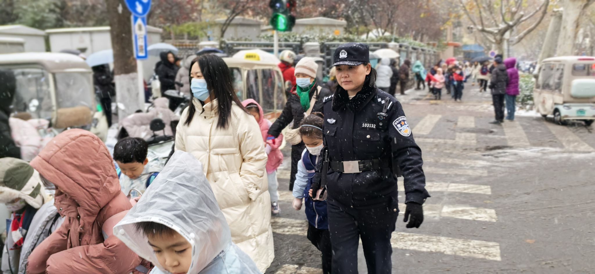 大雪中看見鄭州市公安機關全力以赴,中原、金水等分局的廣大民輔警紛紛走上街頭站好護學崗,雪中見濃濃愛民真情。