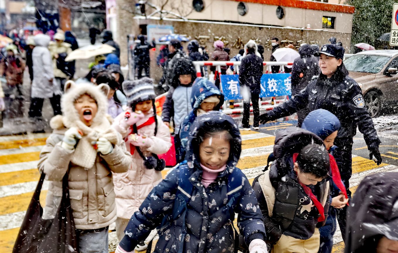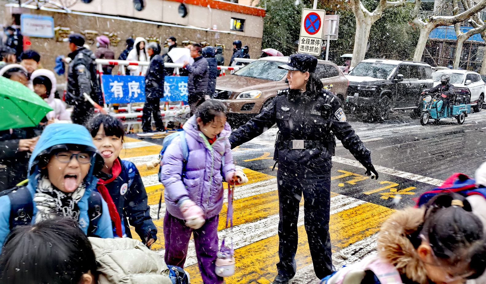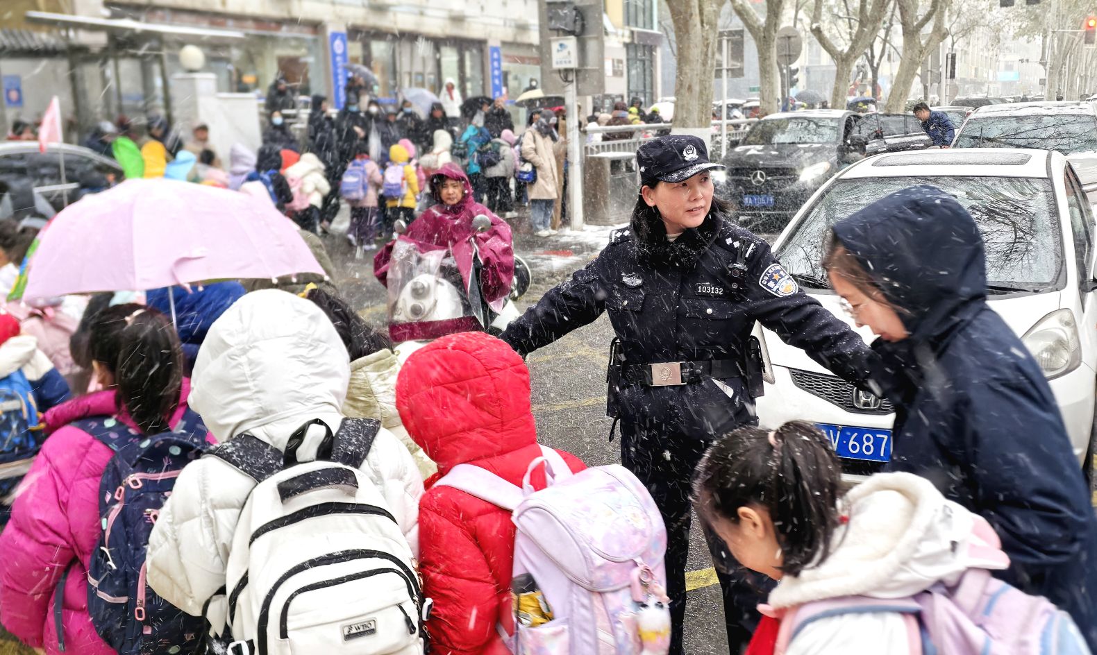 大雪中看見鄭州市公安機關全力以赴,中原、金水等分局的廣大民輔警紛紛走上街頭站好護學崗,雪中見濃濃愛民真情。