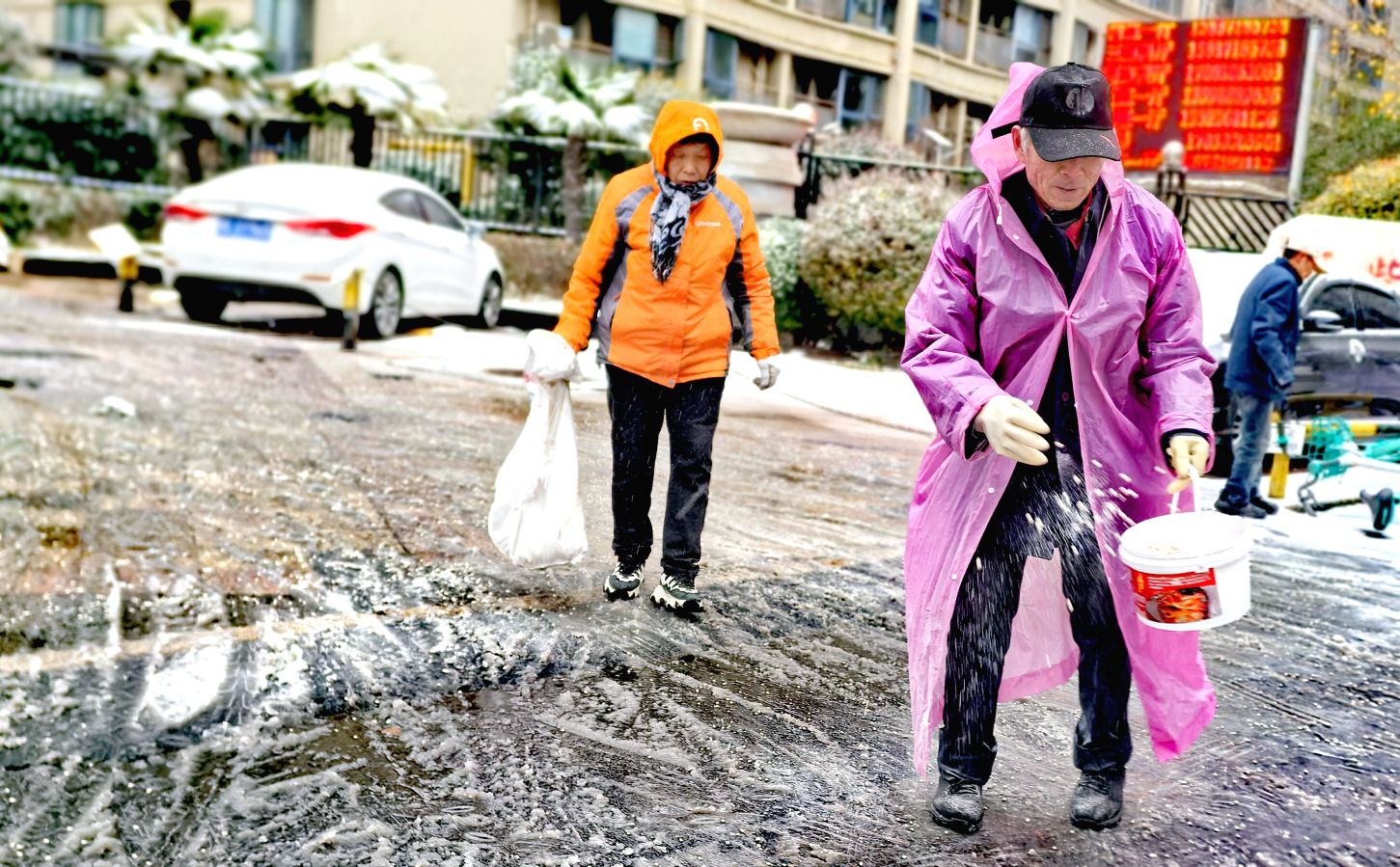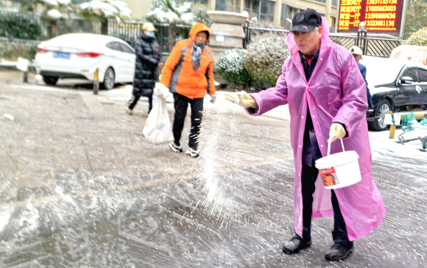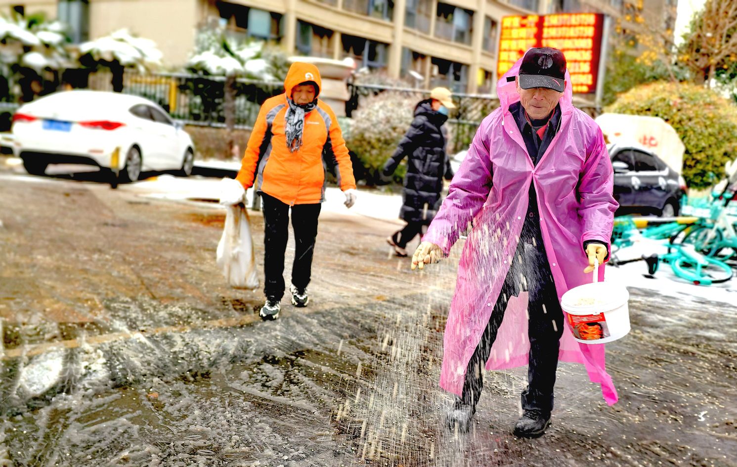 雨雪天有社區老年志愿者主動撒鹽防人滑。