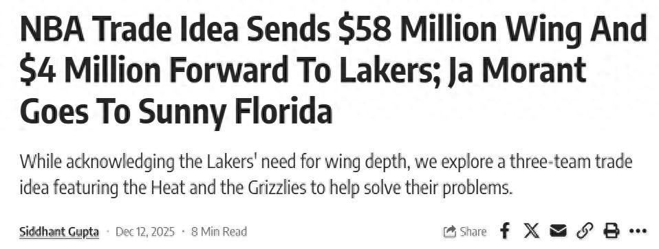 各取所需!在賽季中期交易市場即將全面開啟之際,美媒《fadeawayworld》曬出一筆3方6人交易方案,通過這筆方案湖人如愿拿下維金斯,熱火則押寶“問題少年”莫蘭特。