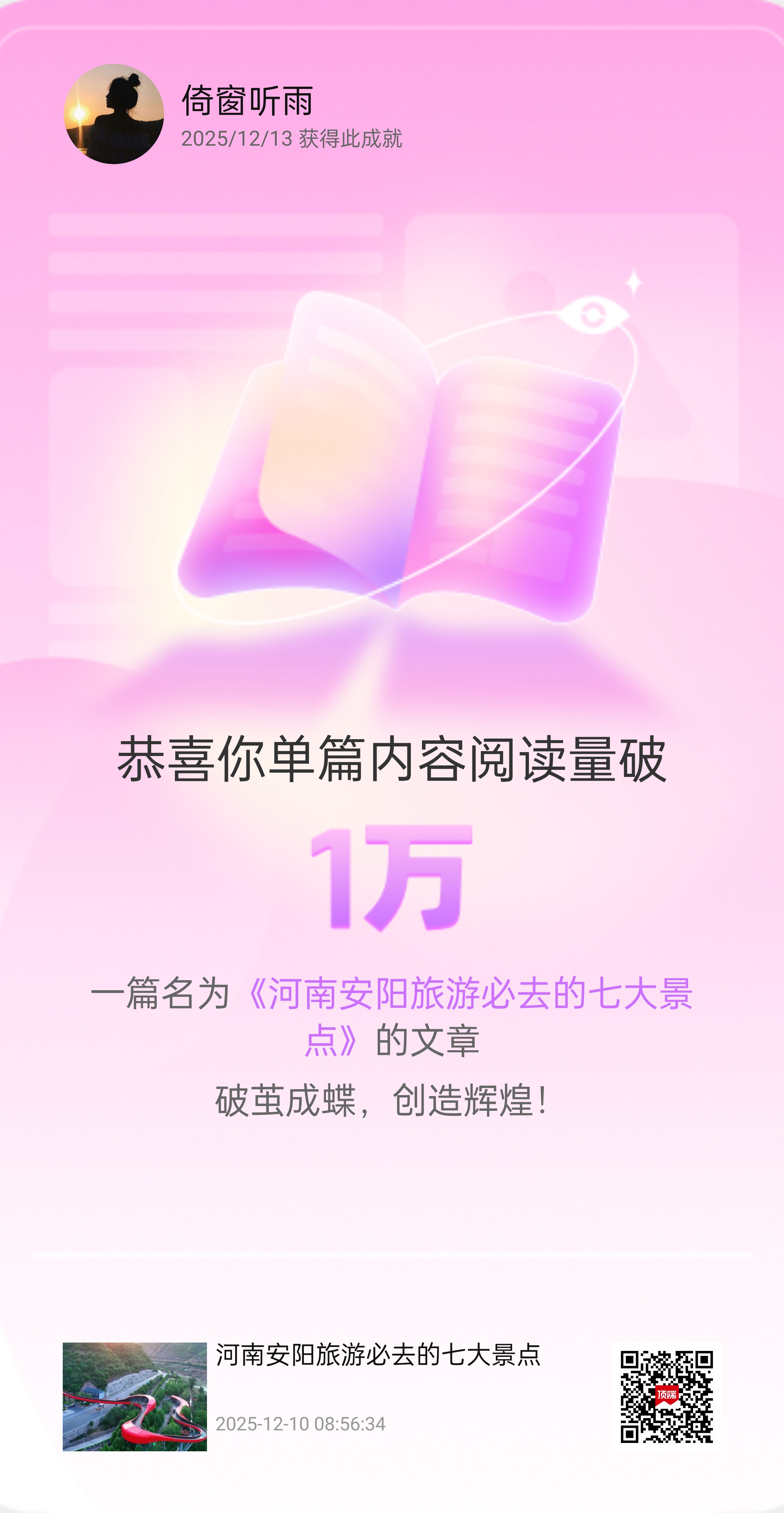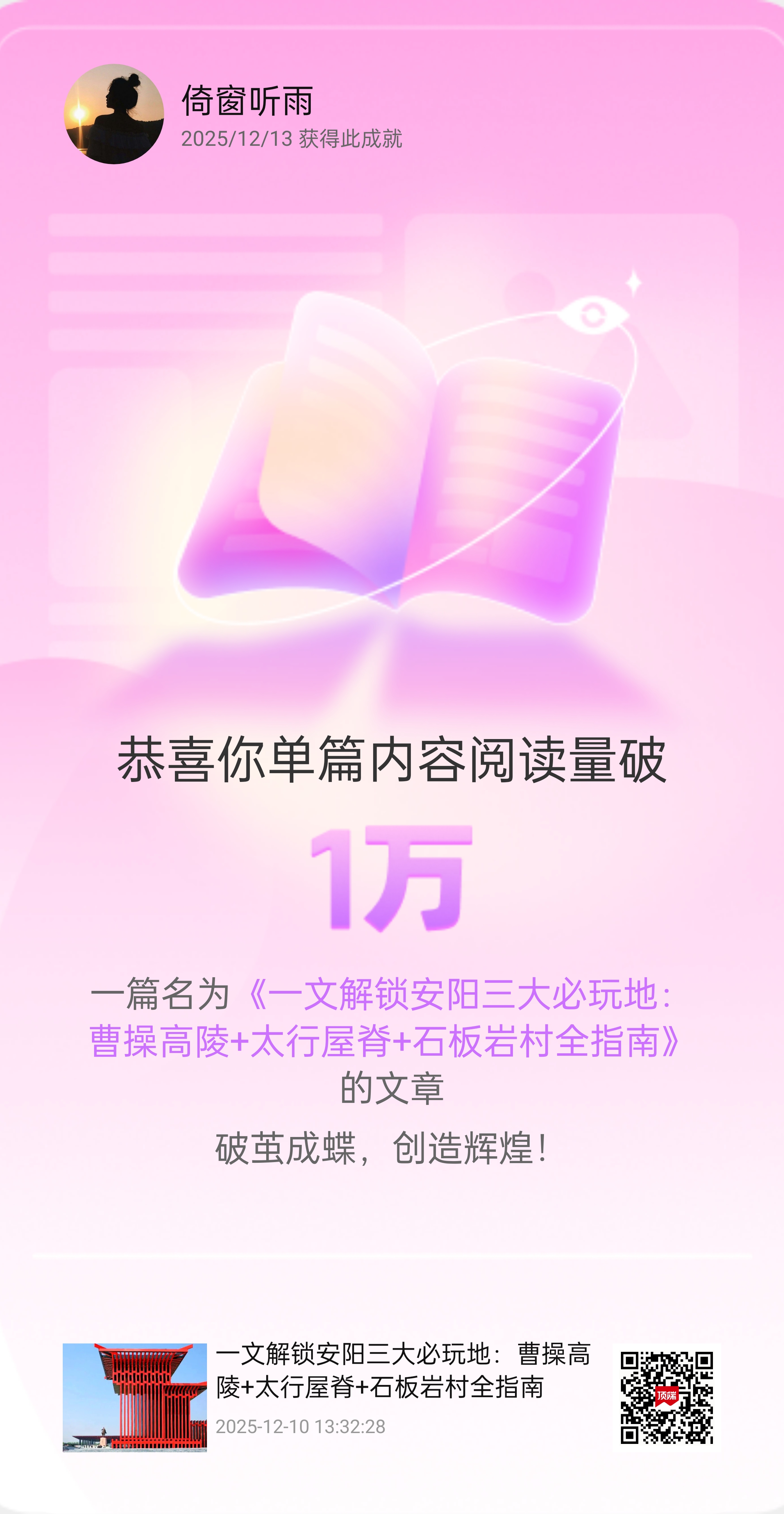 12月13日的消息通知彈出來時,我盯著屏幕上第5個“單篇閱讀量破1萬”的成就卡片,指尖還沾著剛敲完稿的咖啡漬——這三天,好像把攢了半年的“好運”都用在了河南文旅的稿子上。