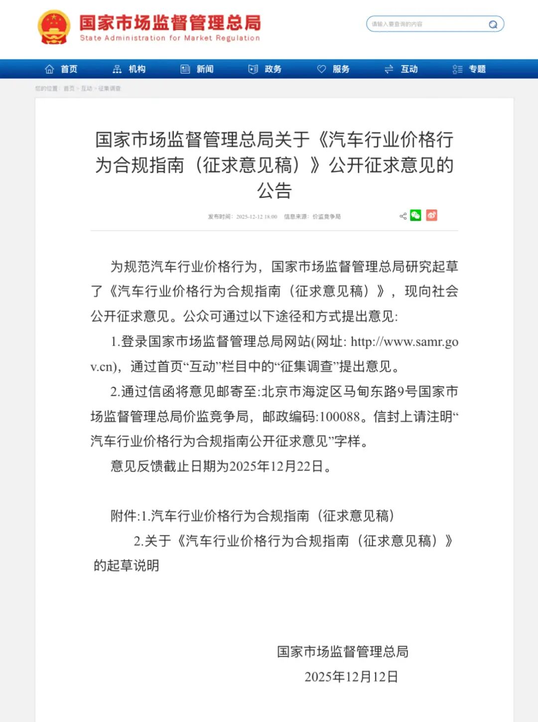 12月12日,國家市場監督管理總局介紹,為規范汽車行業價格行為,國家市場監督管理總局研究起草了《汽車行業價格行為合規指南(征求意見稿)》(以下簡稱“《指南》”),現向社會公開征求意見。《指南》細化了汽車生產企業價格行為規范,明確了從整車到零配件生產、從定價策略到銷售行為各環節的價格合規要求。