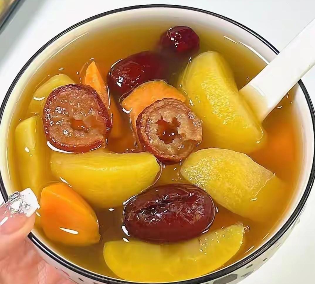 蘋果和紅薯切塊,加幾顆山楂一起煮,煮到紅薯軟糯拉絲,放溫就能喝。山楂消食解膩,紅薯潤腸通便,蘋果中和山楂的酸,酸甜適口,大餐后喝一碗,肚子不脹,氣色更清爽。