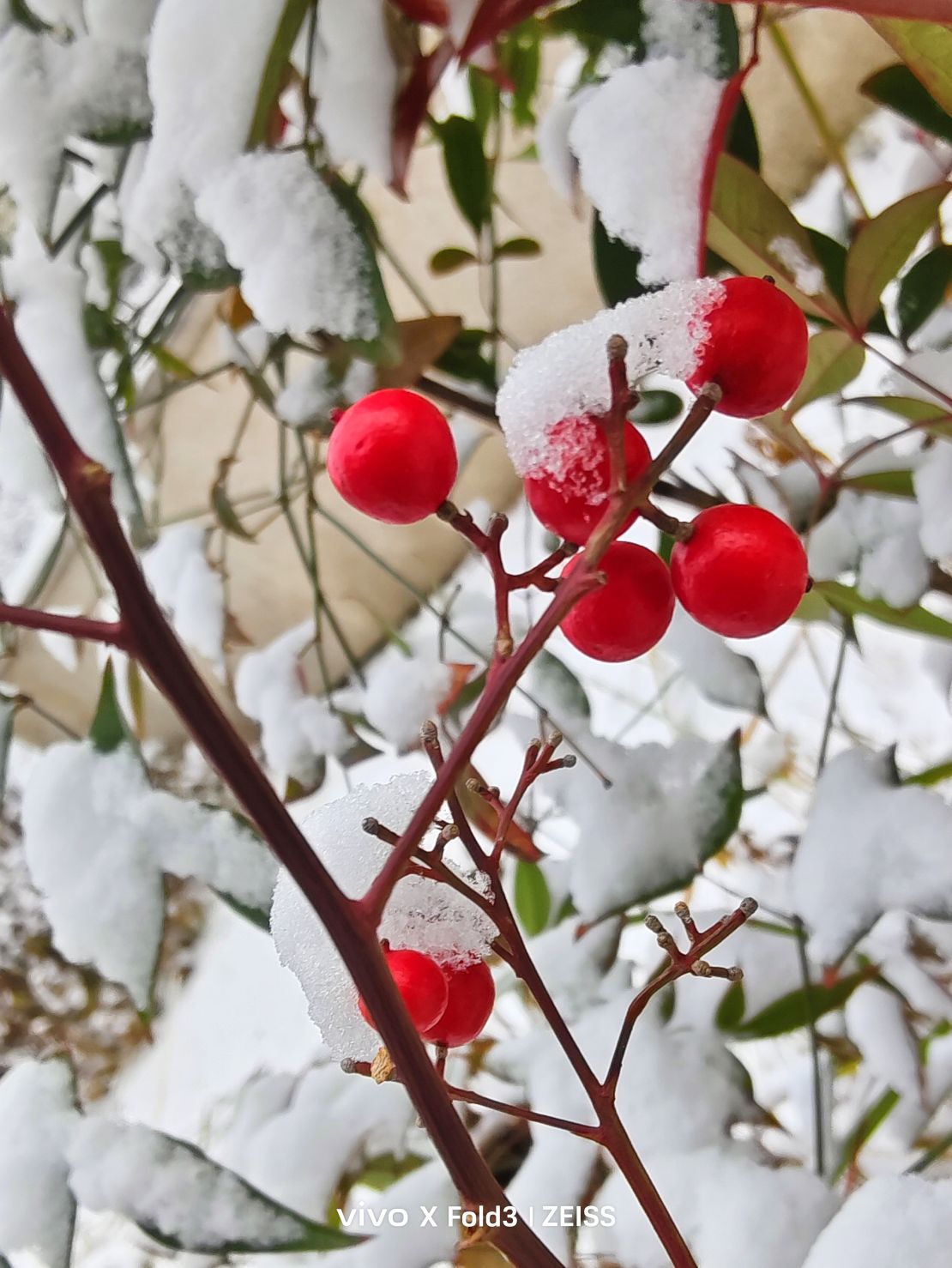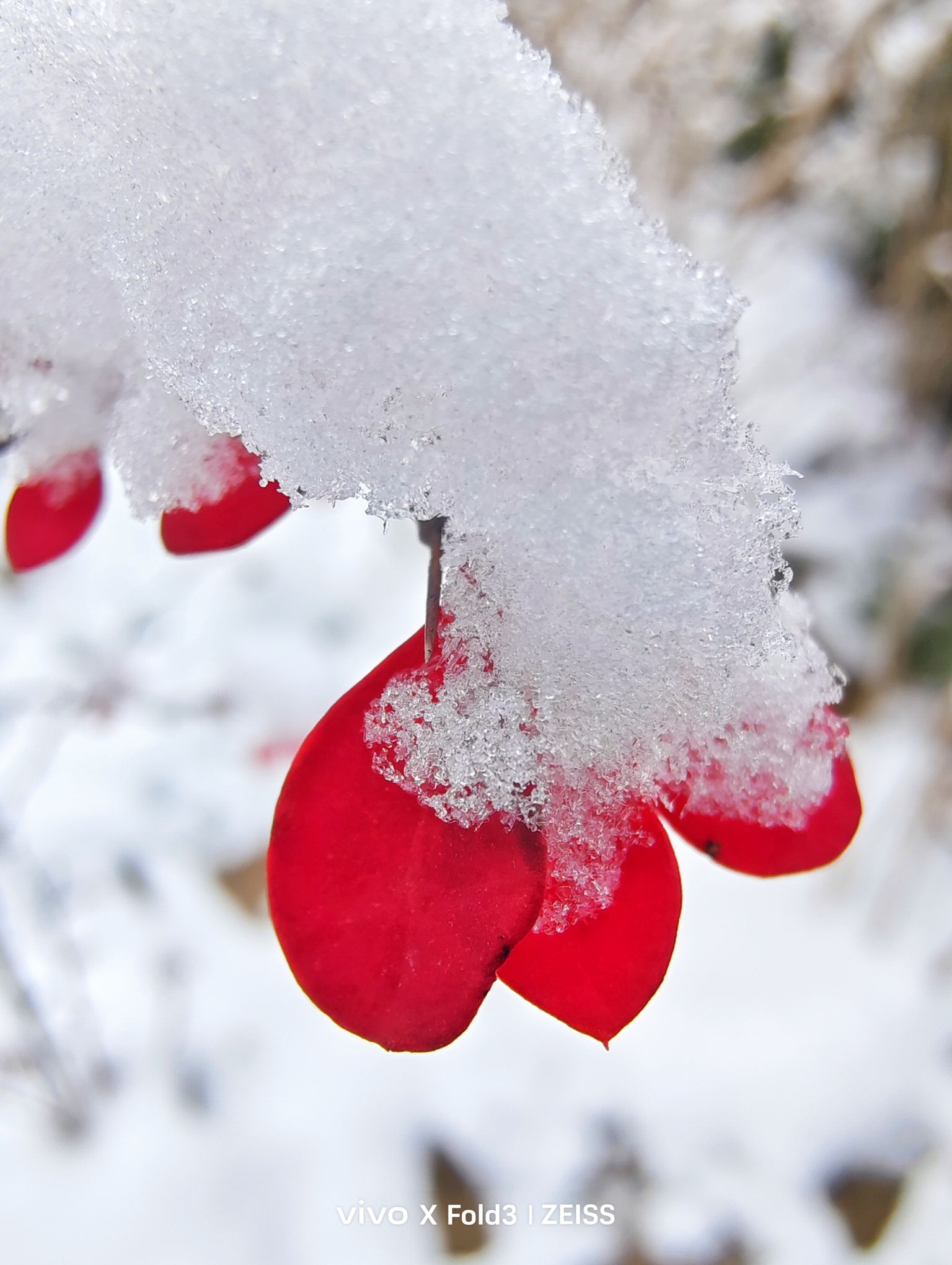 鏡頭轉向路邊,雪壓彎了南天竹的枝椏,紅果裹著雪團像綴了顆顆瑪瑙;紫葉小檗的紅枝從白雪里探出來,艷色灼灼。掃雪的間隙抬眼望去,這些雪中的生機與忙碌的身影相映成趣,冰冷的雪天里,反倒生出融融的暖意。