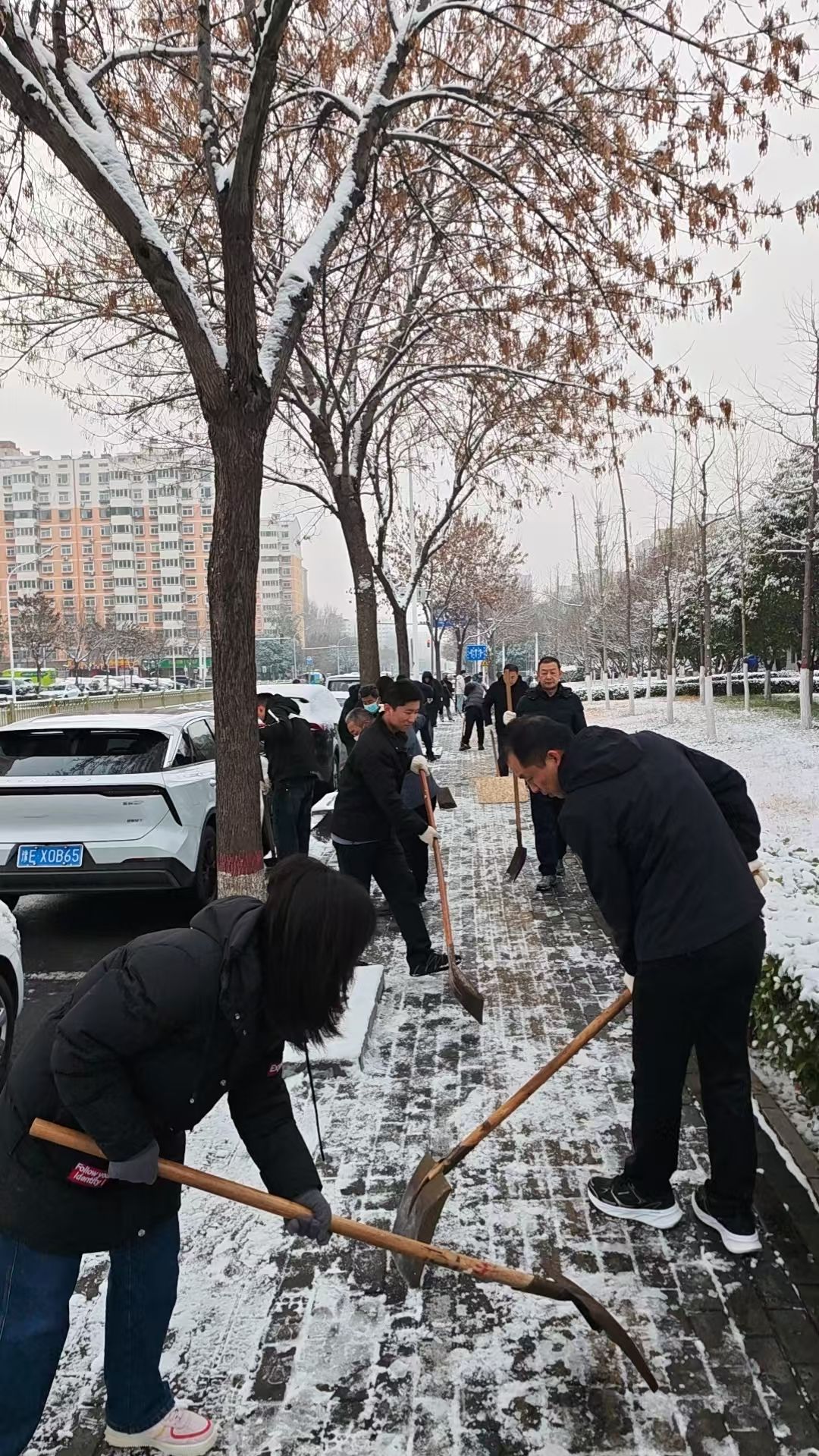 黑色的外套在白雪映襯下格外醒目,有人握著鐵鍬用力鏟起壓實的雪塊,有人拿著推雪板將積雪歸攏到路邊,鐵鍬與地面碰撞的清脆聲響,在安靜的清晨里匯成獨特的節奏。一位女同事弓著腰,手臂隨著鐵鍬的揮動來回發力,額角的碎發沾了些雪粒,卻絲毫沒放慢動作;身旁的男同事則大步向前,一鏟接一鏟地清理著路面,雪沫濺在褲腳,轉眼便融化成濕漉漉的痕跡。