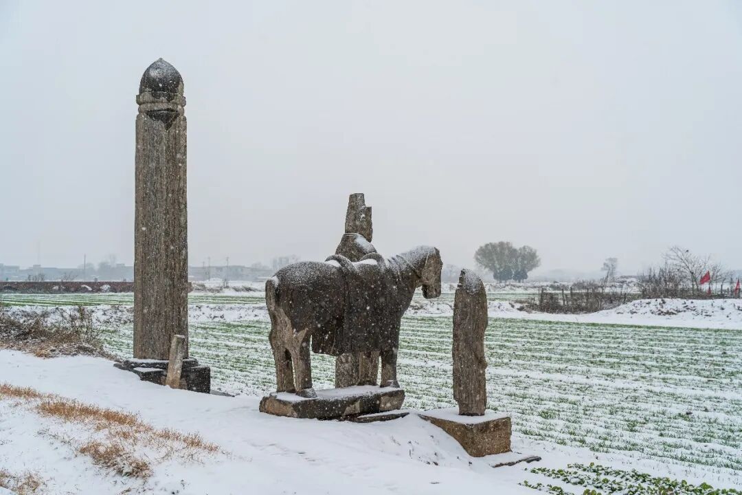 12月12日,鄭州入冬以來首場雪降雪,鞏義西村鎮的元德李后陵石像生披上銀裝。文臣武將肩頭積雪,仿佛喚醒千年守望。麥田青苗在雪被下挺直,與靜默石像展開無聲對話,演繹著生命輪回與歷史凝望的交響。