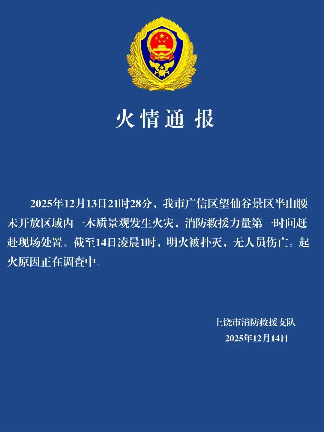 12月14日凌晨,江西上饒市消防救援支隊發布“火情通報”: